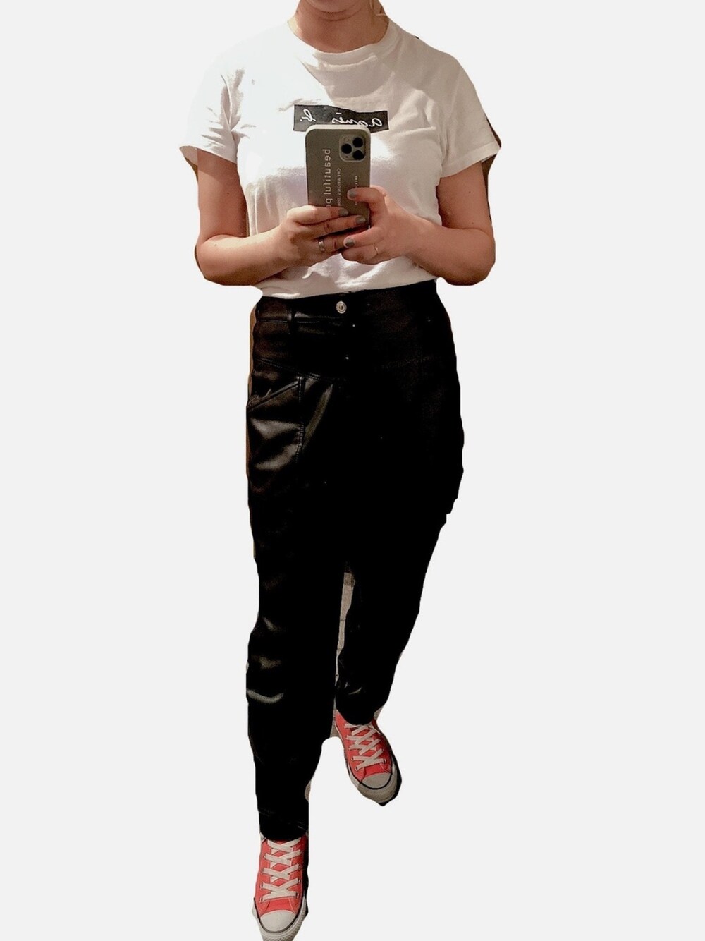 外出前コーデ アニエスベーのモノトーン意識しつつ、 靴でワンポイントな感じ ZARAパンツは革パンです。 instagram→miki0.326