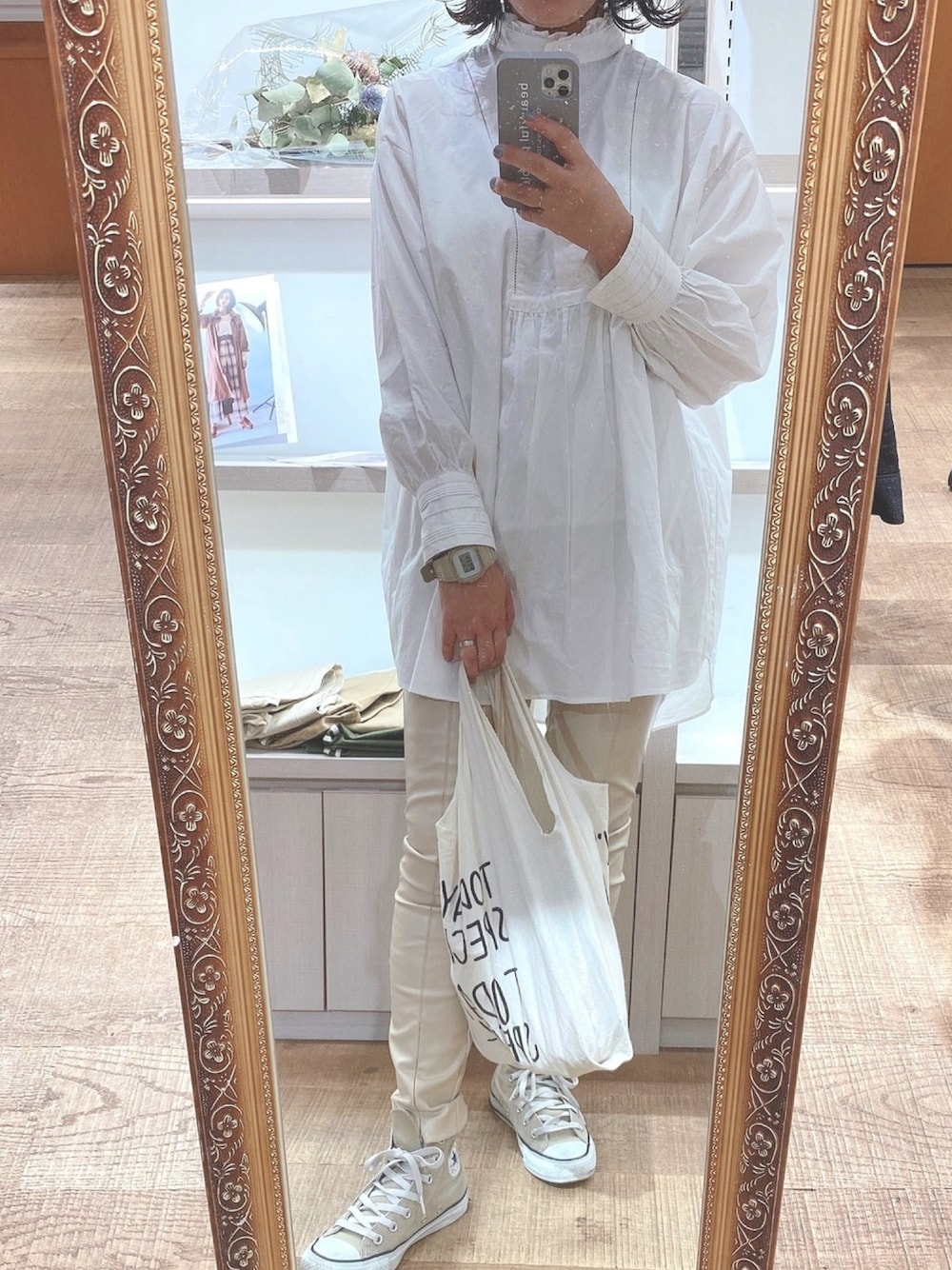 MIKIのシャツ/ブラウス「フリルスタンドシャツチュニック」を使ったコーディネート