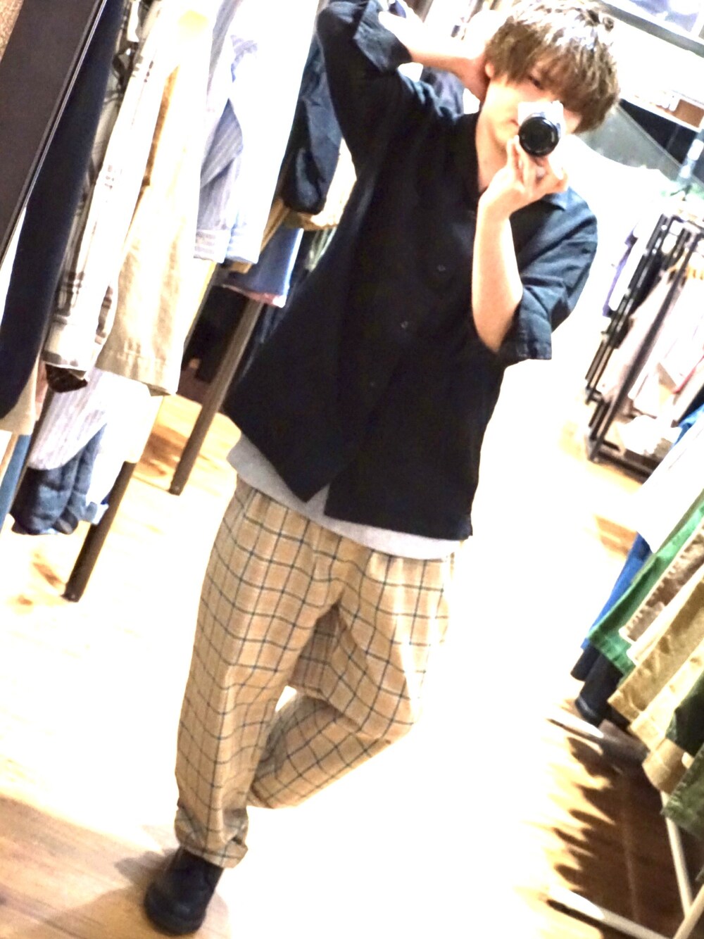 人気のオープンカラーシャツコーデ!王道のチェックを使ったワイドパンツにシンプルで使い回し抜群のオープンカラーシャツで組み合わせてみました!😚
