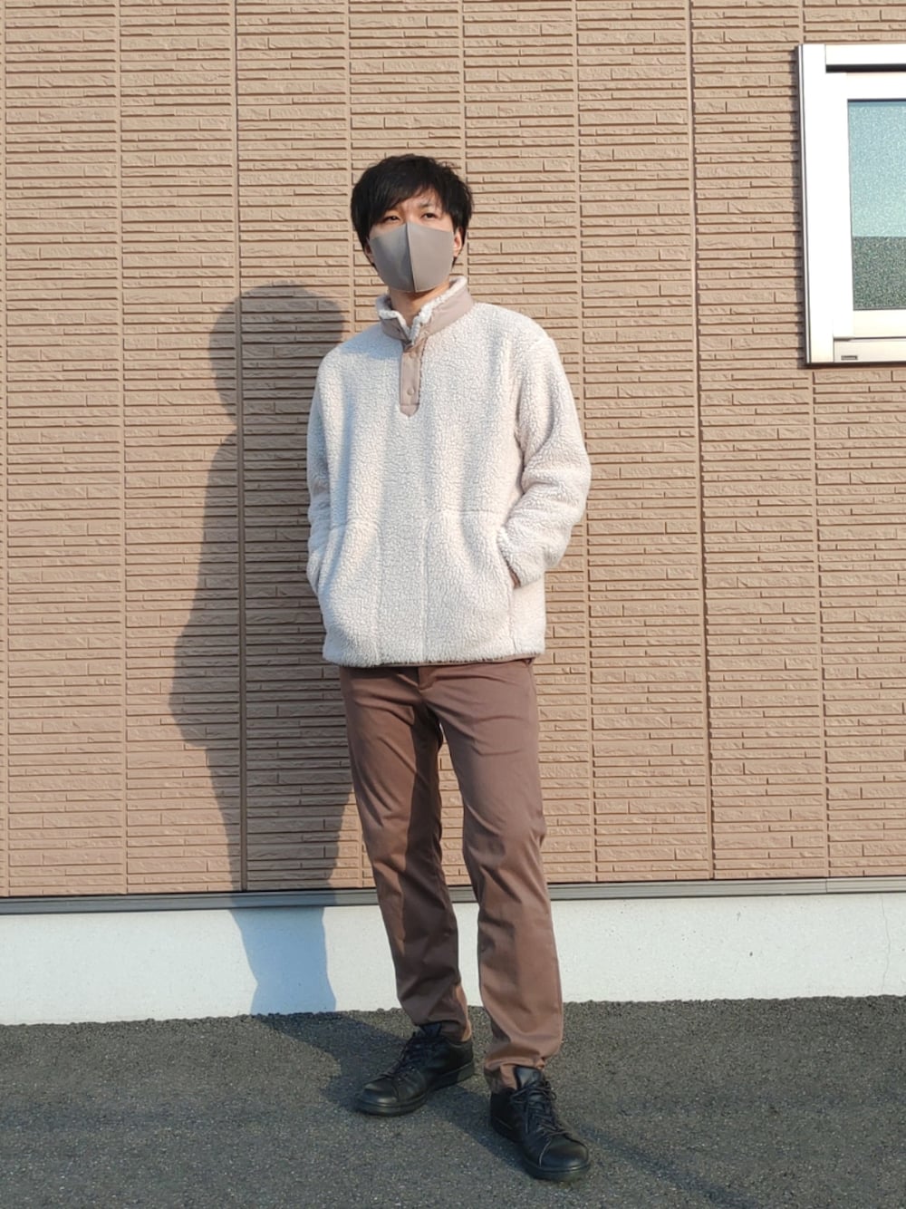 アイボリー×ライトブラウンで、茶系でまとめてみました。 UNIQLO×White Mountaineering のボアフリースは、これ一枚で暖かい優秀なプルオーバーです。 #ホワマンコラボ