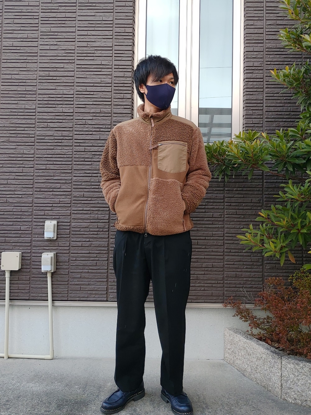 UNIQLO×Engineered Garments(エンジニアド ガーメンツ)コラボのボアフリースブルゾン。 これ一枚で暖かくてインパクトがあるので、他はダークトーンにまとめて合わせました。 軽く羽織れて前ファスナーで着やすいので、ちょっと近くに出掛けるときに便利!