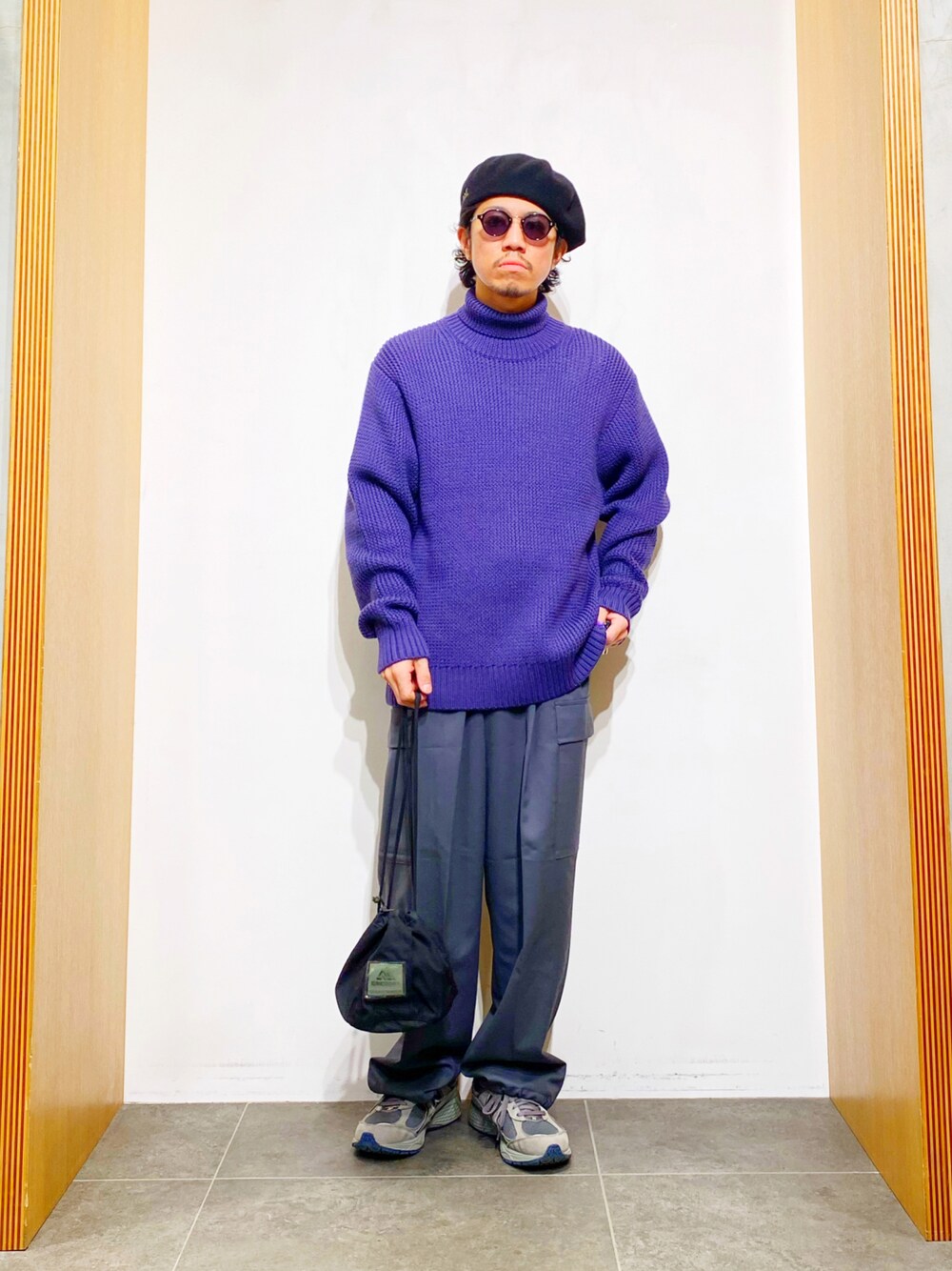 今回はcoseiタートルネックニットとカーゴパンツを使用したコーディネート。 ルーズなボックスシルエットのタートルネックニットは一枚でも抜群の存在感。 もちろんアウターを羽織りインナーとしても◉ カラーも落ち着いたパープルなので色物を楽しみたい方へもおすすめ! パンツはチャコールカラーのカーゴパンツで 落ち着いたカジュアルスタイルに。 ミリタリー合わせのNexusⅦ.×グレゴリーの巾着バッグもいい雰囲気!