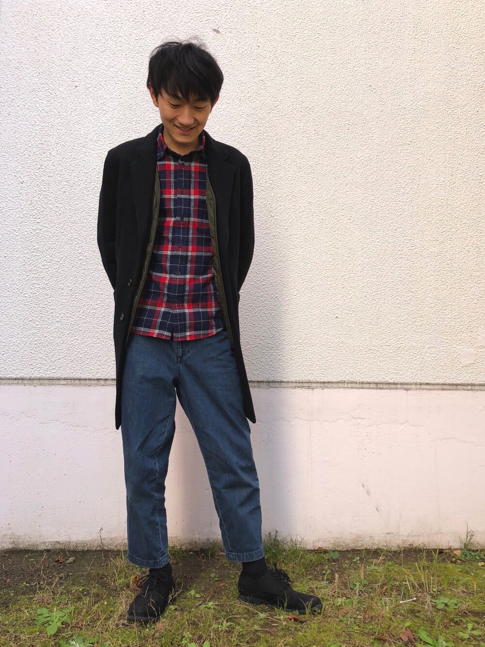 「今日のコーデ」 コートの黒とブーツの黒で全体をまとめました! シャツとデニムのブルーを合わせてゴチャゴチャしないようにしてるのもポイントです! 中は寒いのでユニクロの中綿着てます^ - ^ 出掛ける時はマフラー着けてます🧣 あ〜寒い寒い❄️