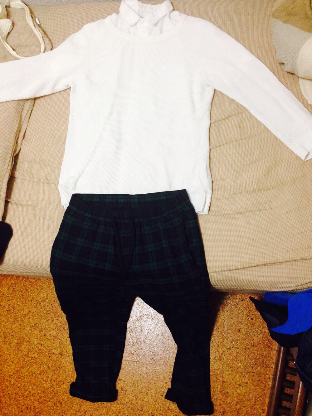 このチェックパンツはルームパンツなんです! でも、着やすいしとてもオススメ! 緑のチェックには白が相性抜群 あと、ネイビーとか黒とか赤もいけそうかな? 靴もローファーと合わせてトラッドテイストで! まあ、是非試してください