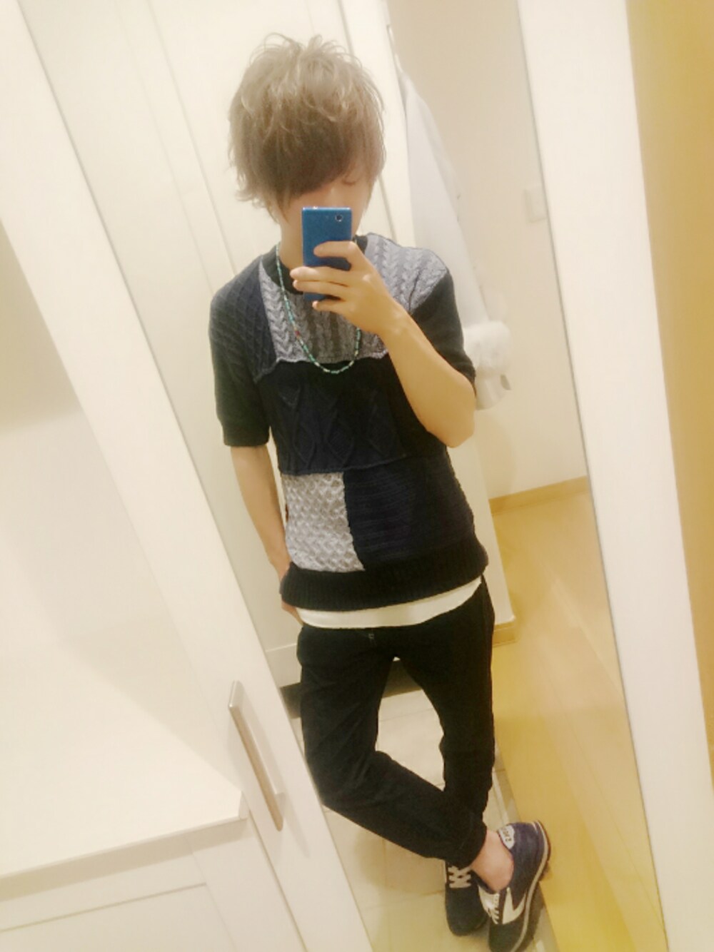ネイビーコーデ( ΦωΦ ) トップスはGLOBAL WORKのパッチワークのニットですヽ(´▽`)/へへっ 今日は3ヵ月ぶりに髪を切りました✂