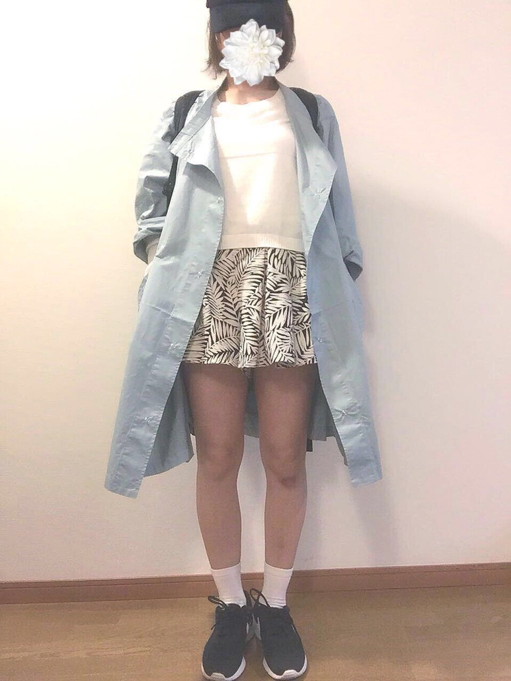 くすみブルーすてき。 まだ朝晩は冷えるので薄いアウター大活躍です。 足のあざはアクセント。
