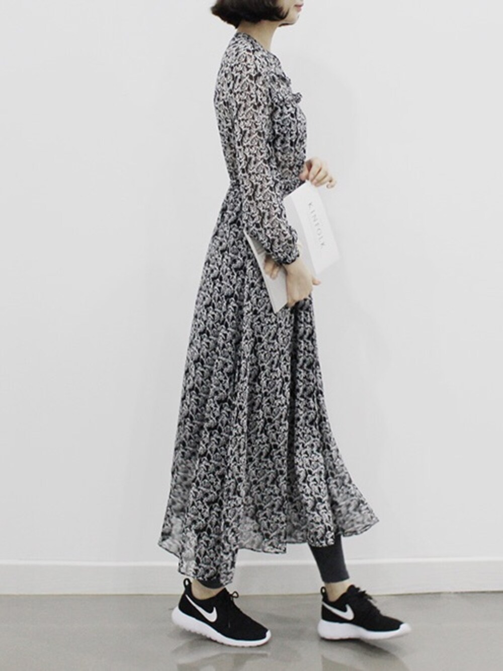 #쉬폰 스타일의 여성스러운 #롱원피스 예요:-) 하늘하늘하면서도 슬림하게떨어지는 라인으로 여성스럽고 날씬해보여요~ 허리에 밴딩처리로 슬림하게잡아주었구요 차이나카라로 더욱매력잇는스타일이에요^^