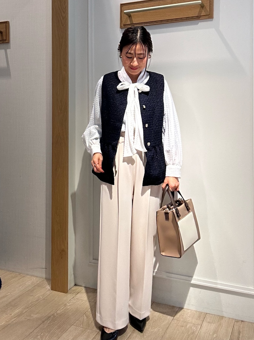 デイリーでもセレモニーでも使えるジレのご案内✨ 昨年も人気だったジレが今年も入荷!! 今回はセレモニーで着ていただけるコーデにしてみました✨ ボウタイブラウスを合わせることで きちんと感がでます✨ キナリのセミワイドパンツを合わせて 入園、入学式で着て頂けます ネイビーパンツにすれば 卒園、卒業式にも👌 ジレはツイード素材ラメなしなので きちんと感があります ペプラムラインがウエスト位置を高くみせてくれます! ボタンがゴールドなのでボタンを全部とめて 着て頂くのも素敵ですよ💓 ブラウス合わせ以外にタートルのニットや 白いTシャツを合わせてカジュアルに着るのも○ ボーダージャガード楊柳リボンタイブラウス 楊柳といってもカジュアルな楊柳素材とは違いとても柔らかくて上品な素材感です リボンの形を作りやすいお紐です✨ シアー感はありますが、気にならないくらいの透け感です ハイストレッチジョーゼットパンツ ポリエステルとストレッチ素材が入った とても履き心地の良いセミワイドパンツです セミワイドなので太すぎずスッキリシルエットです♪ センタープレス入りなので縦長シルエットが 作れます 裏地なしですが肉厚感はありラインも拾いにくいです ウエストはゴム入りなのでとても楽です!! ジョーゼット素材はきちんとした場でも 対応してくれます もちろん普段使用にも楽に履いていただける パンツです 付属のベルト付きなのも嬉しい点です☺️