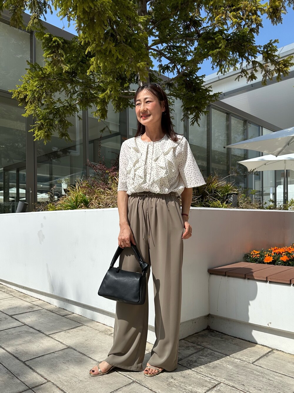 ジョーゼットフリルブラウス ドットやフリルは可愛いですよね🩷 フリルが胸元にあるので華やかな印象に✨ シワになりにくく軽やかに着て頂けます お袖は半袖でフレアなので二の腕をしっかりカバーしてくれます♪ ポリストレッチ ドライタッチパンツ 薄手で裏地なしなので真夏も涼しく履いて頂けるイージーパンツ✨ ウエストがゴムなので楽に履いて頂けます セミワイドシルエットが足のラインをカバーしてくれゆったり履いて頂けます 光沢がありますのでキレイめなコーデにも合いますよ😊 光沢エアリーテーラードジャケット七分袖 春夏羽織って頂けるシアージャケット✨ 昨年も大人気でしたこのジャケットは今年も入荷しました! 今年はホワイト、ベージュ、ブラックの3色🩷 大人っぽく着こなしたい方にはブラックをオススメ🖤 シアー感があり光沢もあるので ブラックでも重たい印象なく羽織って頂けます ゆったりシルエットで肩はドロップショルダーなので ゆるい着こなしに✨ お袖は折り返しているので羽織るだけでこなれ感があります! 着丈がヒップまであるので腰回りやヒップをカバーしてくれます とても軽く涼しく羽織れるので真夏もご利用頂けます! Instagramでノーリーズアウトレットのおすすめコーデアップしてます✨ @daimon_nolで検索🔍 フォローしてもらえたら嬉しいです☺️