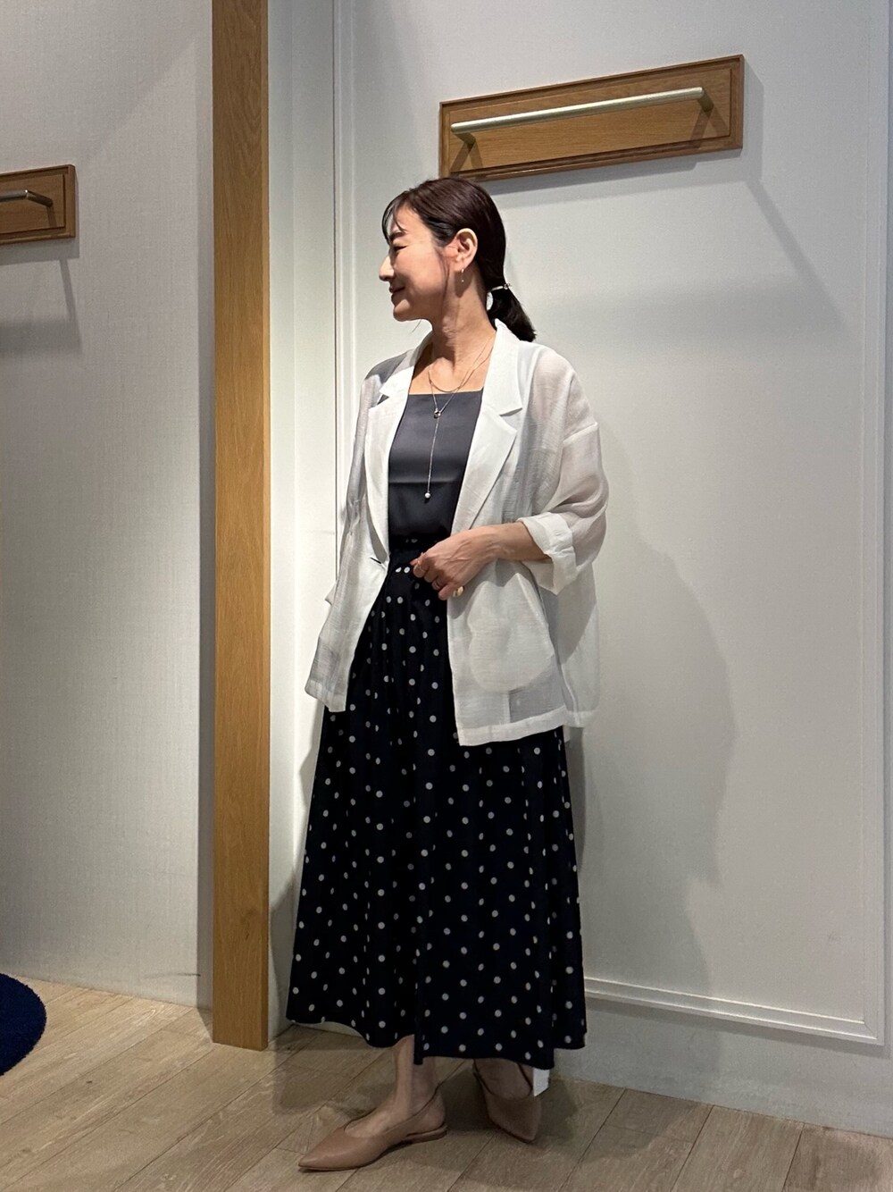 光沢エアリーテーラードジャケット七分袖 春夏羽織って頂けるシアージャケット✨ 昨年も大人気でしたこのジャケットは今年も入荷しました! シアー感があり涼しく羽織って頂けます ゆったりシルエットで肩はドロップショルダーなので ゆるい着こなしに✨ お袖は折り返しているので羽織るだけでこなれ感があります! 着丈がヒップまであるので腰回りやヒップをカバーしてくれます とても軽く涼しく羽織れるので真夏もご利用頂けます! 通勤の羽織りからデイリーの羽織りとしても 着て頂けるトレンド感ある羽織りです! スクエアネックサテンドッキングタンクトップ 去年も人気でしたサテンタンクトップ✨ スクエアネックなので胸元まっすぐなところが どんなトップスを着たときにもスッキリ見えします! バックがカットソー素材なので着心地が良いです 肩紐部分は太めなので下着をしっかり カバーしてくれます♪ リバーシブルタフタドットスカート 毎年人気のリバーシブルタフタスカート✨ 今回はドット柄と無地の2wayです! ウエストゴムはしっかりした太めのゴムです 程よい光沢感がキレイめにもカジュアルにも 対応してくれます💓 着丈は足首がしっかり見える長さなので 小柄の方にも履きやすい着丈の長さです! 透け感はなくオールシーズン使える素材感ですよ♪ Instagramでノーリーズアウトレットの おすすめコーデアップしてます✨ @daimon_nolで検索🔍 フォローしてもらえたら嬉しいです☺️