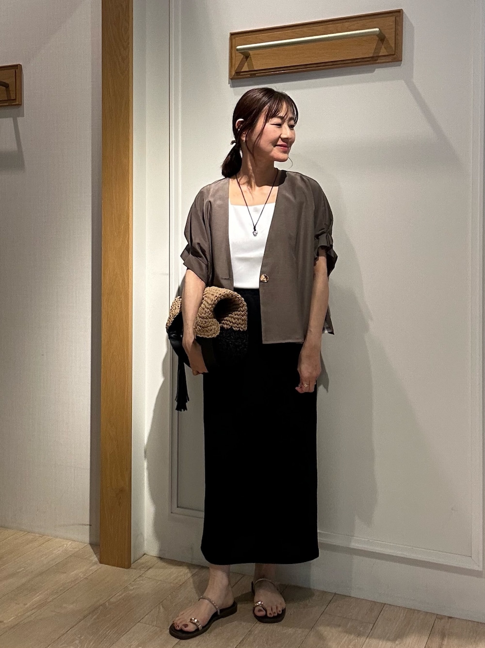 半袖ジャケットとブラックタイトスカート合わせで 大人のリラックスコーデ✨ 《セットアップ対応》 トログログランタック袖ジャケット 半袖ジャケットのショート丈が入荷しました! お袖はデザイン性のあるタックがポイント♪ とても軽くて涼しい素材感です ノーカラーがスッキリと見せてくれます セットアップのパンツと合わせるのはもちろんですが デニムパンツでカジュアルスタイルや スカートスタイル、ワンピーススタイルにも 合わせていただきやすいですよ! スクエアネックサテンドッキングタンクトップ 去年も人気でしたサテンタンクトップ✨ スクエアネックなので胸元まっすぐなところが どんなトップスを着たときにもスッキリ見えします! バックがカットソー素材なので着心地が良いです 肩紐部分は太めなので下着をしっかり カバーしてくれます♪ カットジョーゼットタイトスカート サイドのラメがアクセントになってくれるスカート✨ ウエストがゴムなのでとても楽に履いて頂けます タイトシルエットですが ストレッチ性があるので動きやすいですよ! ペタンコサンダルやスニーカーでカジュアルにしたり ヒールサンダルやパンプス、バレエシューズなどでキレイ目にしたりと 合わせる靴によって雰囲気を変えてくれる 万能スカートです💓 11.25ozデニムバギーパンツ サイズ感は去年より ウエストが細くなり 36サイズでちょうど良いです! 生地の厚みも年中履ける生地感です✨ バギーパンツなのでゆったりシルエット 低身長な私は厚底のスニーカーや 少しでもヒールのあるサンダルで合わせますよ✨ 《セットアップ対応》 トログログランパンツ 程よい光沢感が上品に見せてくれるセミワイドパンツ✨ ウエストがゴムなのでとても楽に履いて頂けます セミワイドなのでシルエットがすっきり! 薄手ですが、透け感はないので安心して涼しく履いて頂けます! Instagramでノーリーズアウトレットの おすすめコーデアップしてます✨ @daimon_nolで検索🔍 フォローしてもらえたら嬉しいです☺️