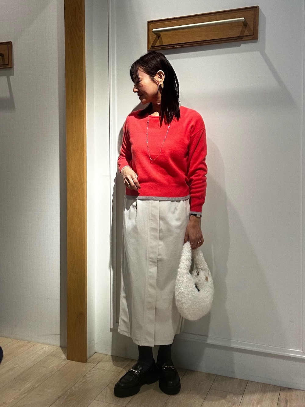 カシミヤ100 配色クルーネックプルオーバーニット カシミヤ素材がとても柔らかい肌触りの癒しニット✨ 首周りの開きは少ないので安心感があります 袖口と裾の部分に配色があることでもとまりのあるスタイリングに♪ 方はドロップショルダーなのでうごかしやすいです コンパクトの丈感なのでパンツ、スカートどちらもインせず外に出して着て頂けます! ストレッチ起毛ナロースカート 細コールなので暖かみがあります✨ 程よいタイトシルエットなので楽に履いて頂けます 後ろスリットなので足さばきが楽ですよ! ウエストはゴムなのでとても楽に履いて頂けます♪ 身長154センチで足首が見える着丈です😊 冬のホワイトはかわいいですよね🩷 《撥水》 ストレッチライトタフタショートコート 毎年人気のショートダウンコート💓 マットな素材感ですがストレッチ性がありますので とても着心地が良いです! 首周りのダウンが包み込んでくれストールなしで羽織って頂けます☺️