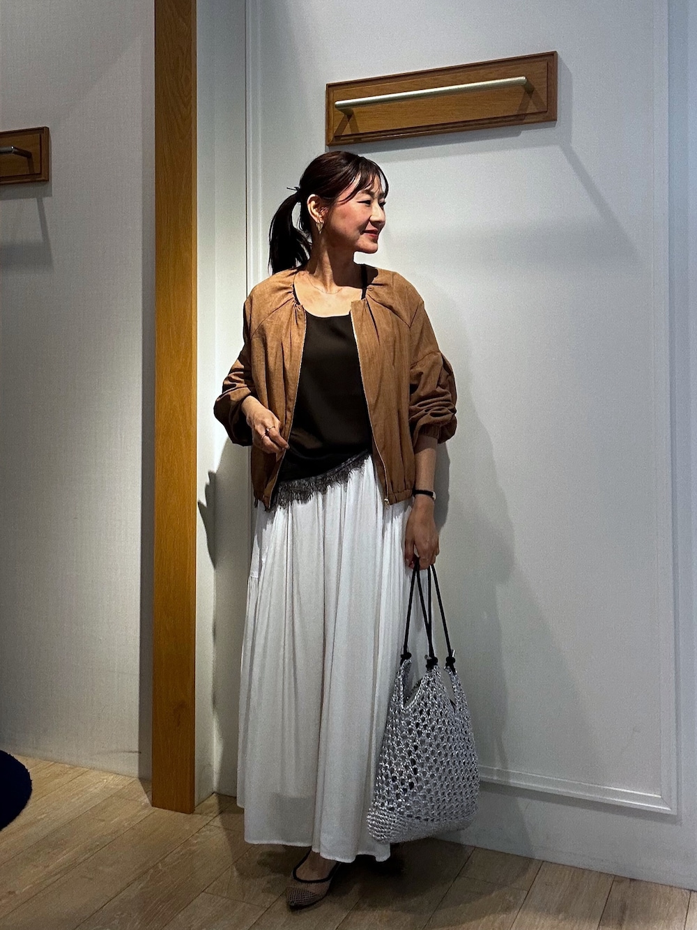 春の爽やかコーデ✨ キャメルのブルゾンに ホワイトスカートを合わせて 爽やかなリラックスコーデ✨ インナーはブラウンのタンクトップで引き締めて! タンクトップの裾のレースに 動きを出したかったので 片側だけ少しスカートにインして 斜めなシルエットにしてみました😊 麻調ノーカラーホイップスリーブブルゾン 軽やかに羽織れるブルゾン✨ 麻の様な風合いを持ち、サラッと羽織っていただけます! ノーカラーなので首周りスッキリ♪ 裾はゴム入りなので自然なギャザー✨ 肩はドロップショルダーでホイップの様なお袖のギャザーがポイントに💓 袖口にもゴムが入っているので袖を上げるのも簡単! コンパクトな丈感が小柄さんにもピッタリですよ! サテン×スムース裾レースタンクトップ レイヤードを楽しめるタンクトップ✨ 裾のレースがレイヤードした時のポイントとなり 一気に旬な着こなしに💓 一枚持っていると色んな着こなしのポイントになってくれます🎶 ギャザー切替スカート 軽やかに履いていただけるスカート✨ ウエストゴムなので楽に履いていただけます! ギャザーデザインがお腹周りやヒップ周りをカバー👍 丈は長めですので大人なスタイリングにピッタリです☺️ Instagramでノーリーズアウトレットの おすすめコーデアップしてます✨ @daimon_nolで検索🔍 フォローしてもらえたら嬉しいです☺️