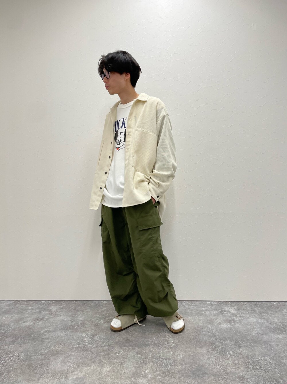 古着風オーバーサイズコーデ 通気性の良いツイードパナマシャツは シャリっとした肌あたりで梅雨時期辺りまで 羽織りとして活躍してくれるアイテム シャツの緩さに合わせて パンツもリラックス感あるカーゴパンツで インナーはミッキーのラグランTでワンポイント!