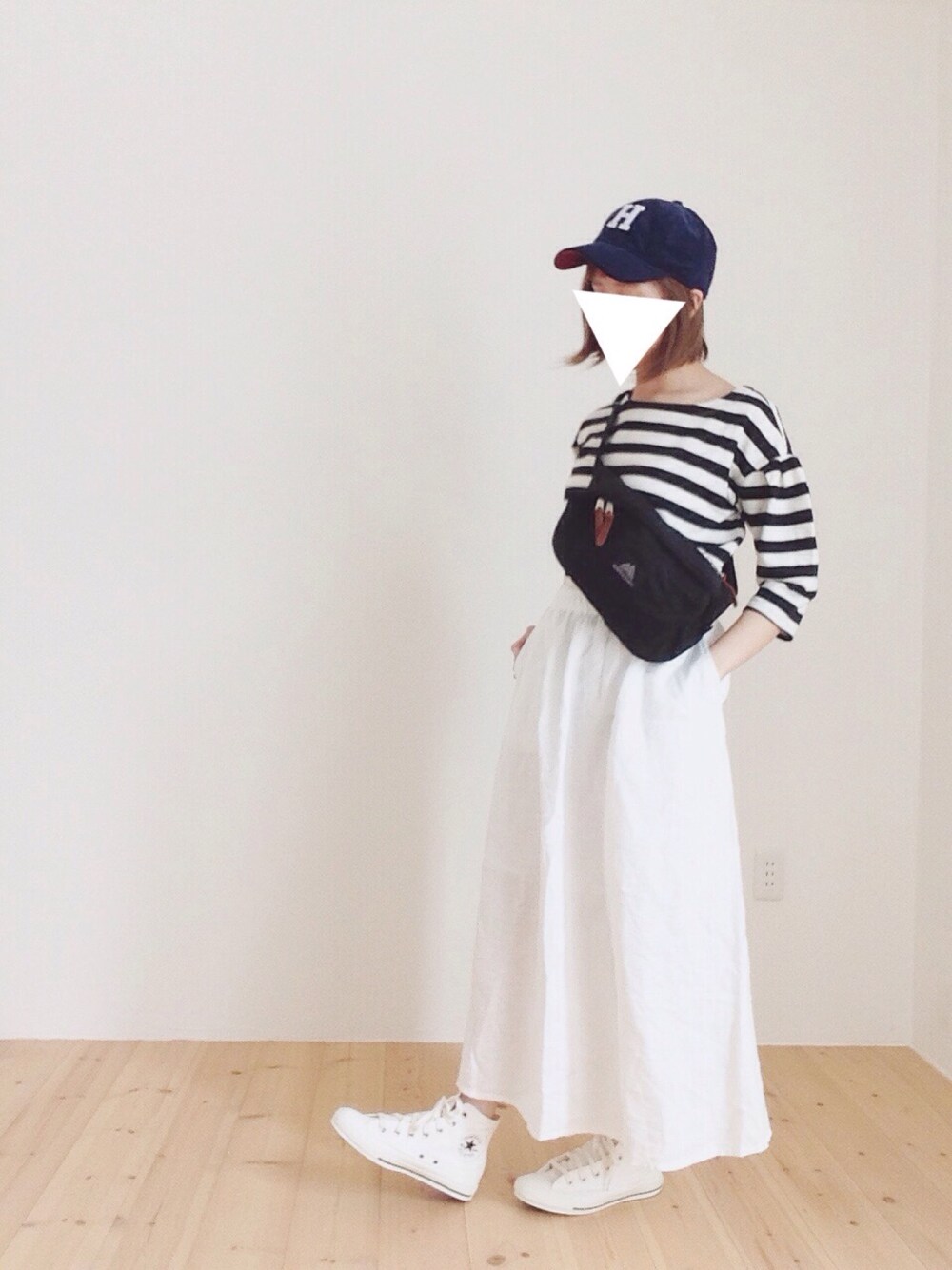 ボ ー ダ ー ト ッ プ ス の 袖 が か わ い い ☺︎ 白 の ロ ン グ ス カ ー ト と ボ デ ィ バ ッ グ を 合 わ せ て シ ン プ ル す っ き り .