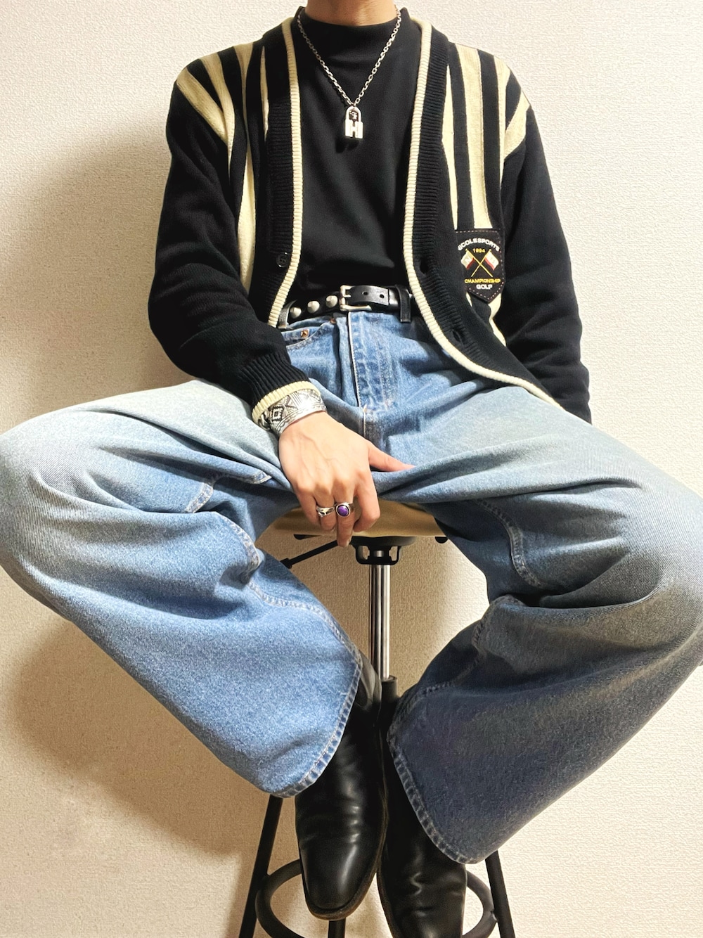 🦓🦓🦓🦓🦓🦓🦓🦓🦓🦓🦓🦓🦓🦓🦓🦓🦓🦓 おはようございます!☀️ コーデのテーマは、『ワイドパンツ』!👖✨ ストライプカーディガンと、 スタッズベルトの合わせで、ロック調に!🎸 ⚫︎カーディガン NICOLE GOLF(90s) ⚫︎デニムパンツ Cheap Monday ⚫︎ブーツ Vintage (イタリア製) ⚫︎ベルト Vintage (カナダ製) ⚫︎ネックレス HERMES ⚫︎アクセサリー NAVAJO いつも、いいね&お気に入り ありがとうございます!!😄😄 モチベ上がります!!🔥🔥