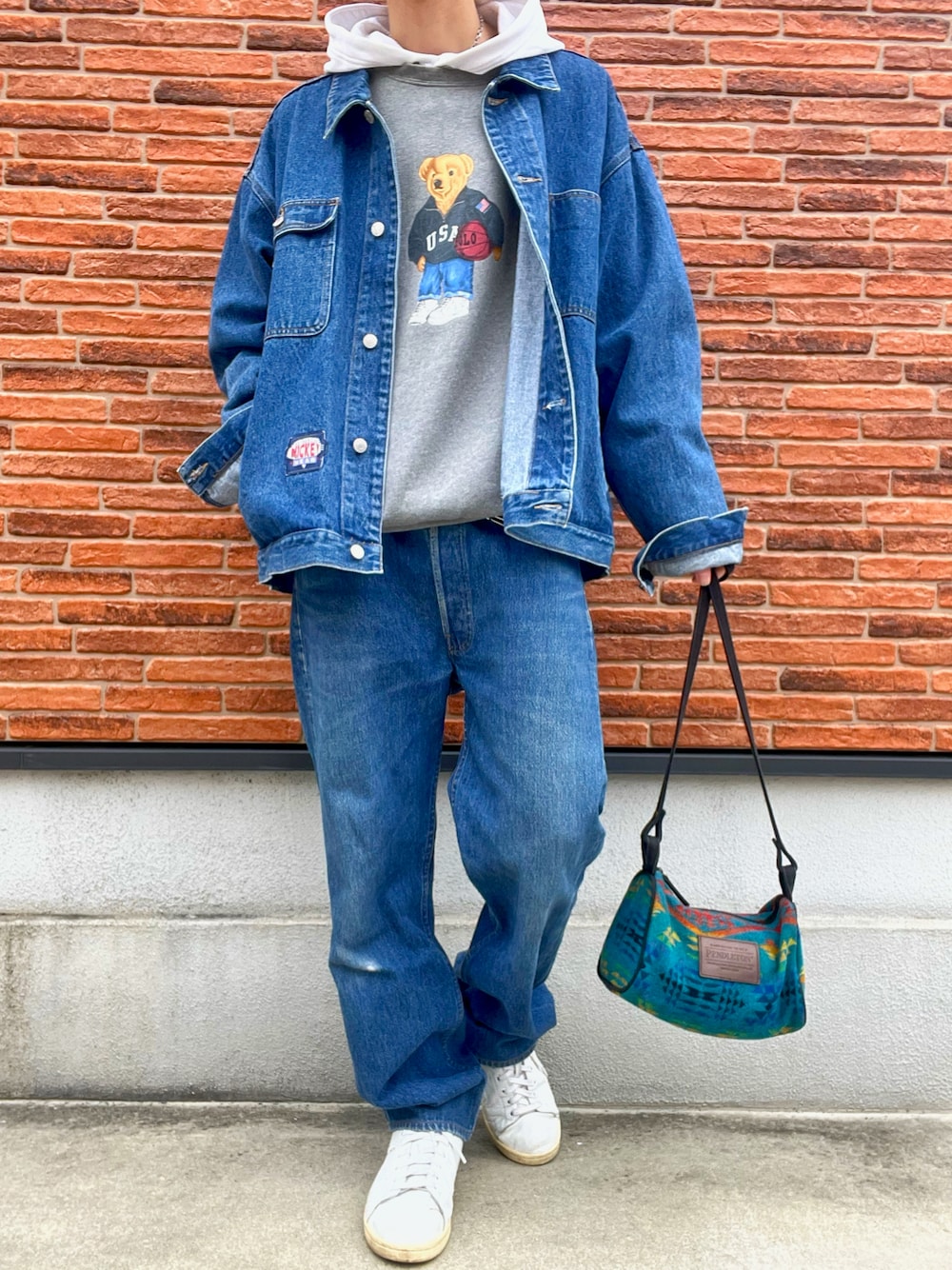 👖👖👖👖👖👖👖👖👖👖👖👖👖👖👖👖👖👖 おはようございます!☀️ 本日のピックアップタグ【#スニーカー】👟 昨日投稿しようとしたデニムコーデです🤫 スニーカー履いて撮ったのを今日に回しました! 大体お出掛けする時は革靴と決めており、 この写真は近場で撮って帰って着替えて出かけました笑 なんか革靴じゃないと気分が上がらなくて🤔💭笑 さて、コーデですがデニムのセットアップです! デニムの色は持っている中から近い色味のものを合わせました! ※撮り忘れましたが、バック刺繍でミッキーがいます!🤙🏻 雰囲気はアメカジで統一したかったので ラルフローレンのポロベアのスウェットを使い、 ポロベアとお揃いのデニムパンツと白スニーカーで 合わせるこだわり笑🧸👖👟 バッグも、アパレルやラグマットなどでお馴染みの 米国老舗ブランドのペンドルトンです!🏺 スウェットとパーカーのレイヤードは本当暖かい!🔥 気温にもよりますが、インナーにヒートテックとか 着ればアウター要らずで出掛けられる程ですよ!😄 アウター要らずで動きやすくて楽ちんな感じ好きです✌🏻✨ ------------------------------------------------------ ⚫︎デニムジャケット Disney (90s) ⚫︎スウェット Ralph Lauren (OLD) ⚫︎パーカー adidas (00s) ⚫︎デニムパンツ Levi's (80s) ⚫︎スニーカー adidas (スタンスミス) ⚫︎バッグ PENDLETON ------------------------------------------------------ いつもいいね、お気に入り、フォルダイン、コメント ありがとうございます!!めっちゃ嬉しいです!!😄😄 投稿のモチベ上がります!!🔥✊🏻🔥 Instagram≥daiki_gram_66 是非繋がってください!👼✨