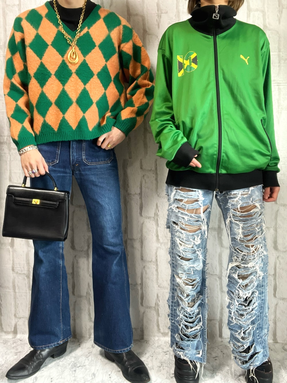 👘🦖👘🦖👘🦖👘🦖👘🦖👘🦖👘🦖👘🦖👘🦖👘 いつも、ご覧頂きありがとうございます!🥹 いいね、お気に入り、フォルダイン、コメント ありがとうございます!めっちゃ嬉しいです!✨ おはようございます!☀️ 本日のピックアップタグ【#春服みてみて】🏷️ ジョジョの世界観のようなダイヤニットや、 やり過ぎなぐらいクラッシュダメージが過ぎる デニムパンツがポイントです!💡♦️👖 写真3枚目、ラテン系なコーデの感じなので、 横ノリしてみました♪🤭🇯🇲笑 ※明日のコーデは、モノトーンで揃えました!🐼 良かったら明日も見て下さい!😉🫶🏼 -------------------------------------------------------- ⚫︎ニット 古着 ⚫︎デニムパンツ BIG JOHN (70s) ⚫︎ブーツ CoSTUME NATIONAL HOMME (00s) ⚫︎バッグ 古着 (90s 日本製) ⚫︎ネックレス Monet (80s) ⚫︎ジャージ PUMA (00s) ⚫︎デニムパンツ Levi's (リメイクブランド) ⚫︎厚底スニーカー YOSUKE -------------------------------------------------------- Instagram≥daiki_gram_66 是非繋がってください!👼✨