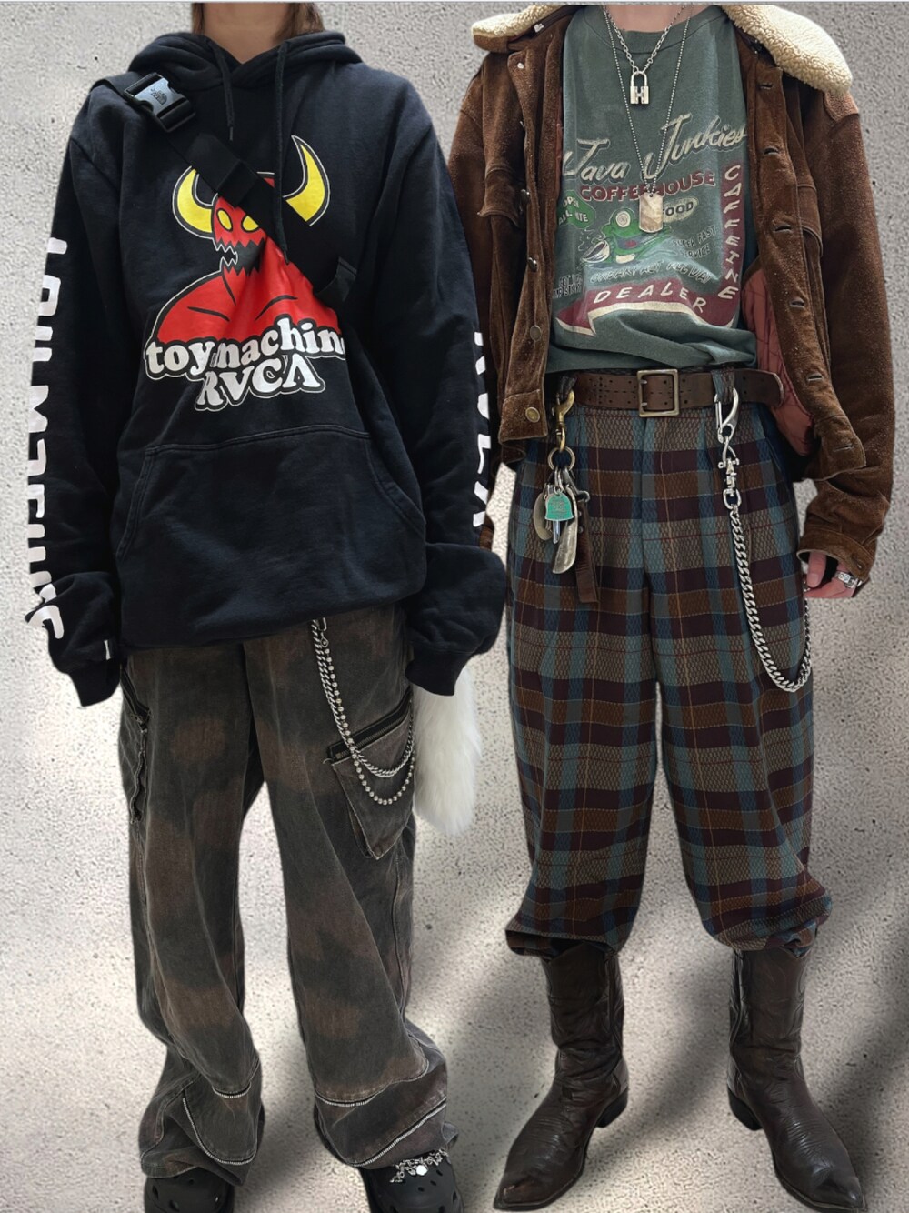 ・パーカー/トイマシーン×ルーカ ・サンダル/クロックス/メガクラッシュ ・靴下/adidas ・レザージャケット/vintage/80s ・Tシャツ/vintage/USA製/90s ・パンツ/vintage/日本製/90s ・ウエスタンブーツ/ジャスティン/80s 地底人のアシッドウォッシュブラウン系の 極太デニムパンツが欲しいけど、 繋ぎで買いました(彼女)🥹💕