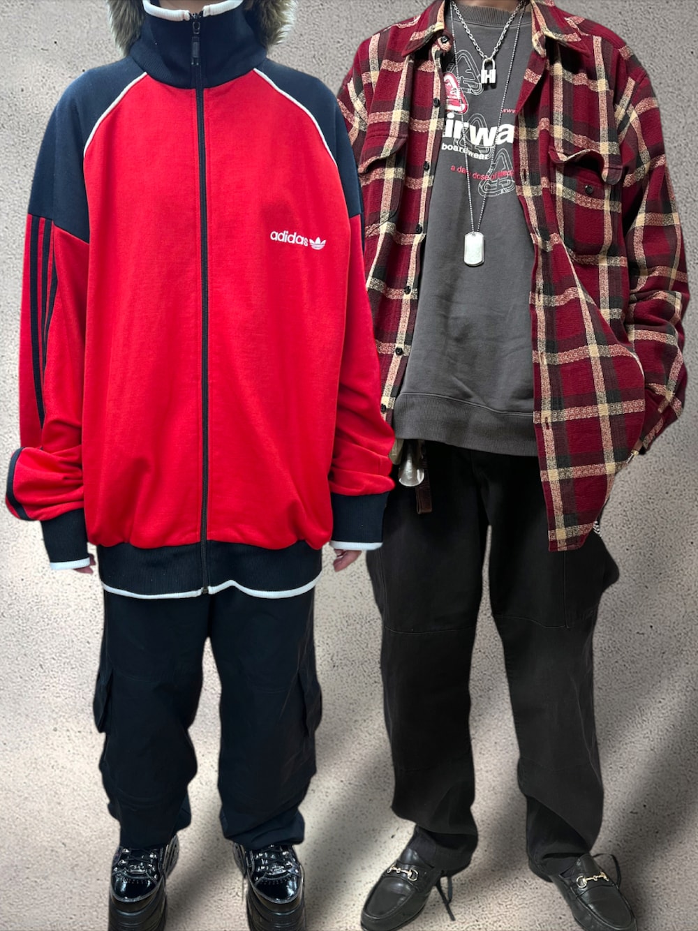 ・ジャージ/adidas/00s ・カーゴパンツ/adidas/00s ・厚底靴/ヨースケ ・チェックシャツ/RRL/90s初期 ・スウェット/エアウォーク/00s ・カーゴパンツ/vintage/90s ・ビットローファー/コールハーン 黒カーゴパンツをお揃いアイテムで使いました! また、今回のサイズ選びは、XL〜5XLまでを着用です😎あと、色合いは彼女はハッキリした色味が好みで、 自分はフェードカラー(色褪せた)が好みですね💭✨