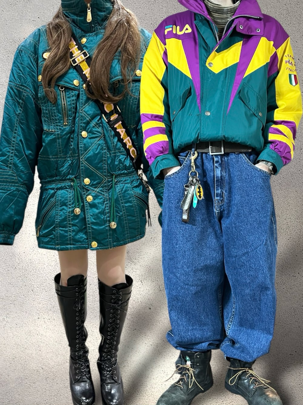 ・ナイロンジャケット/vintage/90s ・バッグ/マークジェイコブス ・ナイロンジャケット/FILA/80s ・ベロアタートルネック/zucca/90s ・デニムパンツ/ゲス/90s ・ブーツ/レッドウィング/90s 派手なデザインが特徴的なスキージャケットを合わせて、バブルの頃に思いを馳せたコーデです!