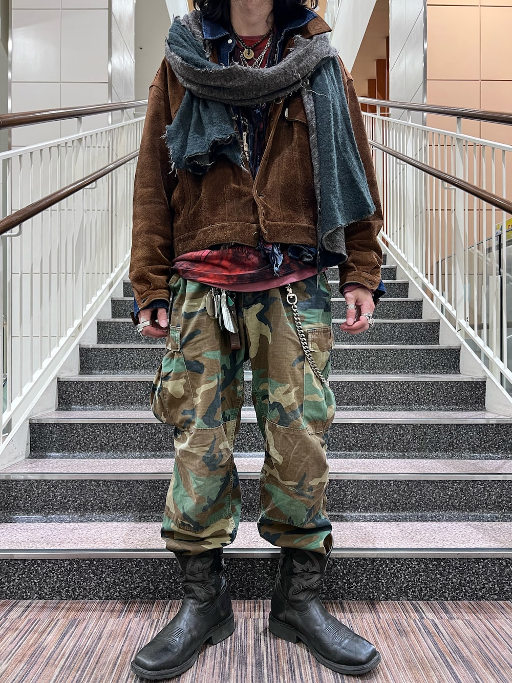 お久しぶりです! ジョニー・デップがカッコいいなと思い、影響を受けて新しく買った服と合わせてレイヤードとかして、 アレンジしたコーデです! 今回のJDポイントは、巻物をたくさん使っているところです!🧣 迷彩パンツは、生まれ年の同期で、 大切にし過ぎてあんま履けてませんでした🥹