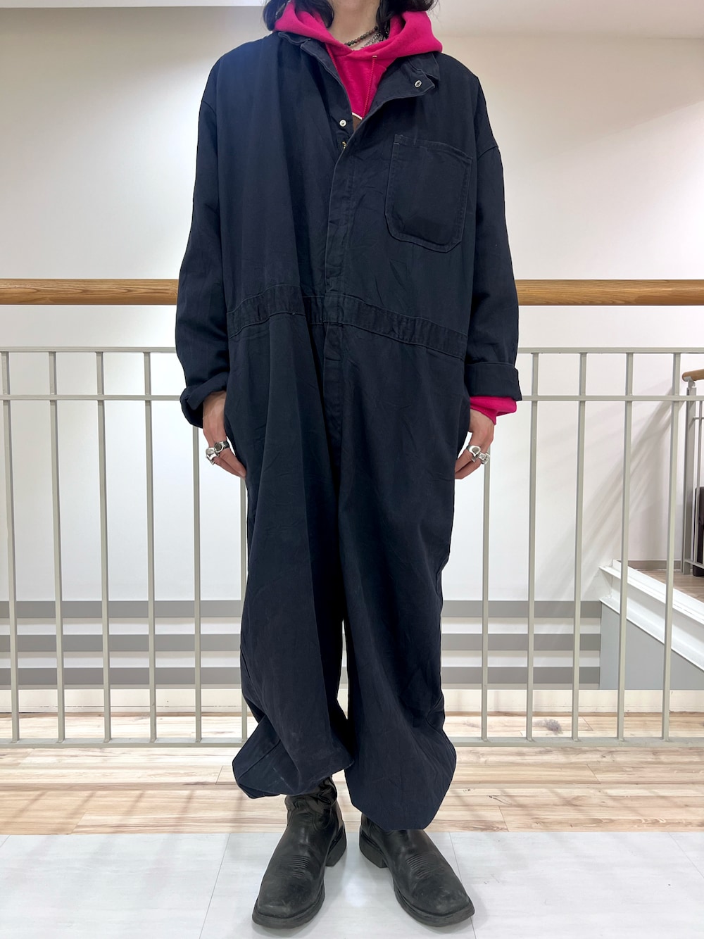 ・オールインワン/Vintage/90s ・パーカー/チャンピオン/90s ・ブーツ/Vintage オールインワンは5XLくらいのサイズで、ダボっとしたシルエットが気に入っています! 差し色に選んだチャンピオンのパーカーは、あまり見かけないマゼンタカラーで、春らしい華やかな色合いです!🌸