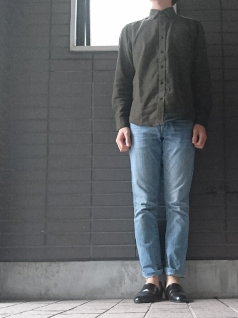 グリーン系のシャツ/ブラウス、ブルー系のデニムパンツ、ブラック系のドレスシューズを着用したメンズの秋コーディネートの1枚目の写真