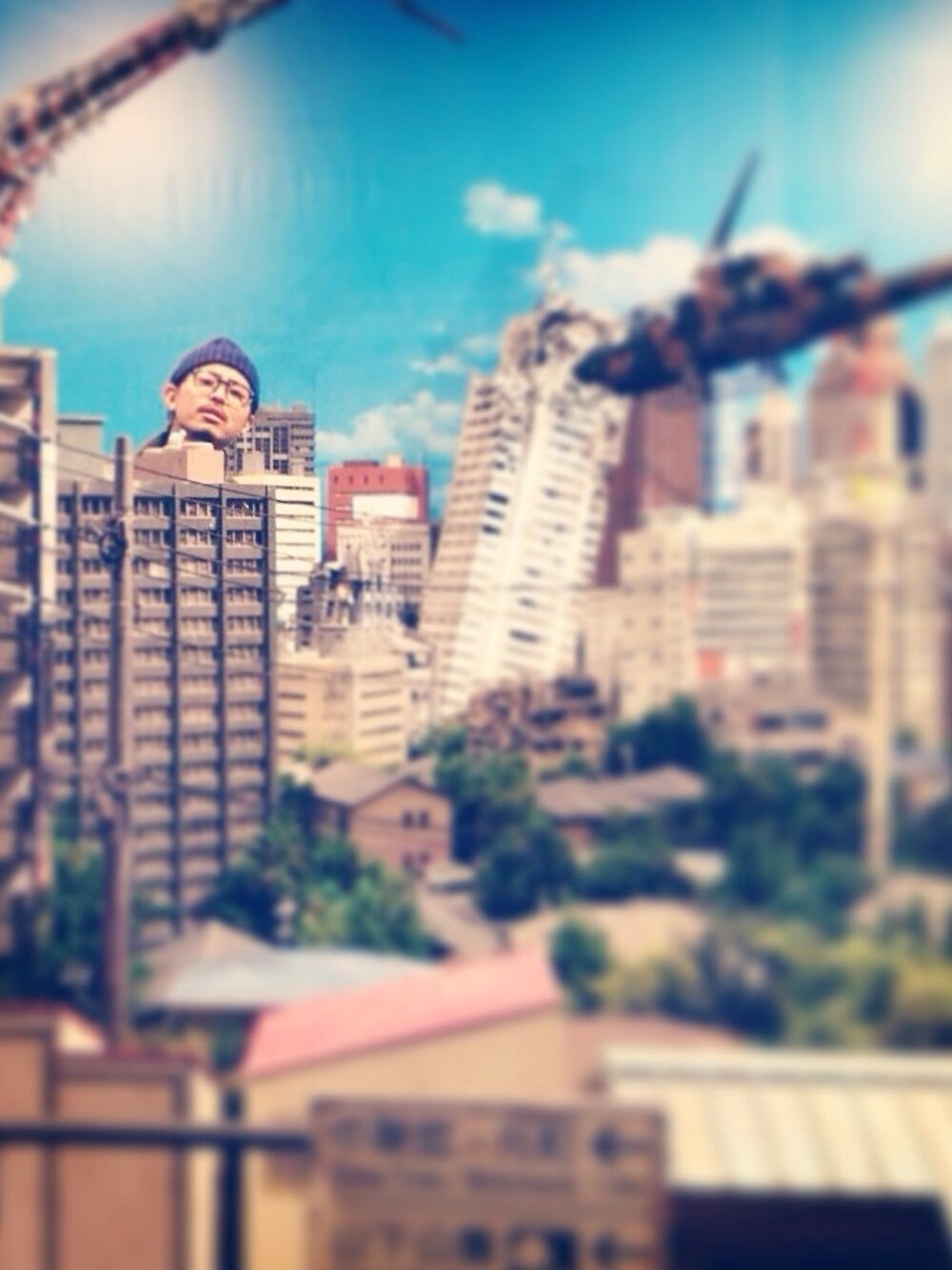 とある日のコーデ。 普段顔出ししていませんが、 コレは逆に顔面しか出てない稀なパターン。 広大なジオラマの中で 巨大化したヒーローや怪獣の視線を 疑似体験したときの1枚です(^o^)