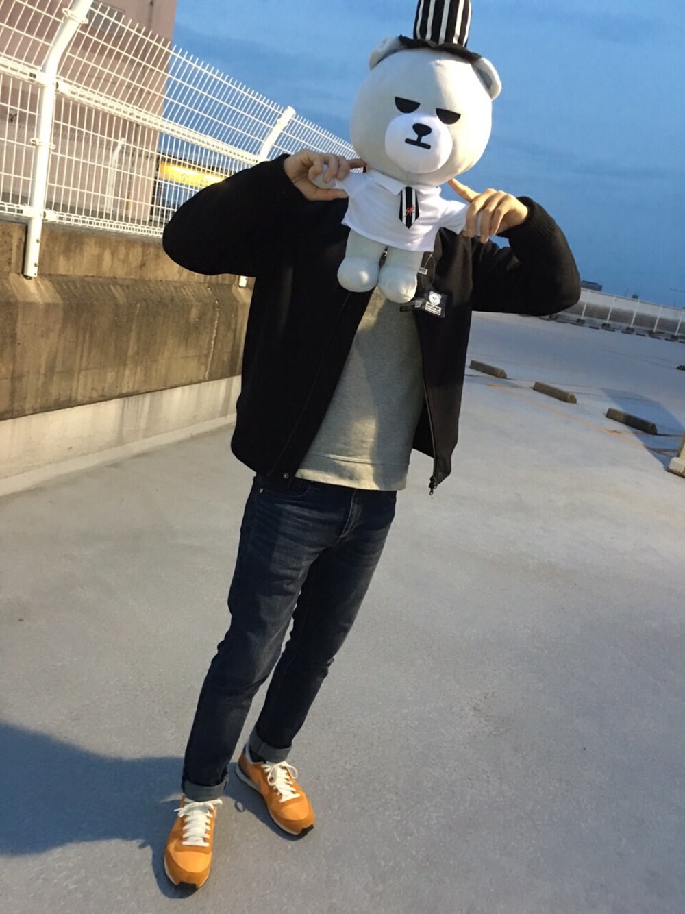 日曜のコーデです。寒かったです。 人形はUFOキャッチャーでとりました笑