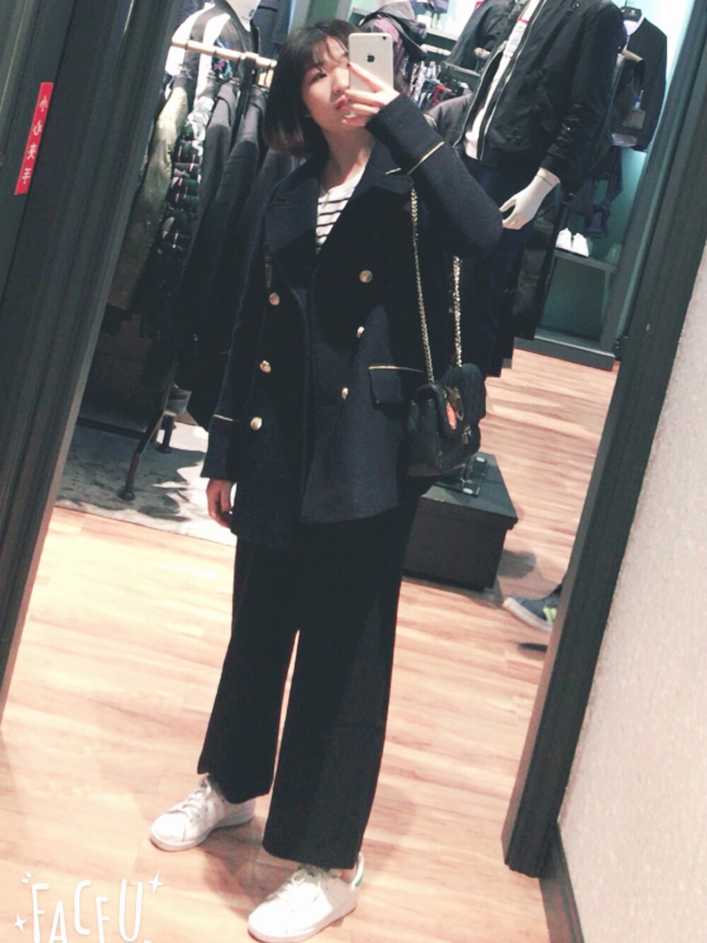 ホワイト系のスニーカー、ブラック系のショルダーバッグを着用したレディースの春コーディネートの1枚目の写真