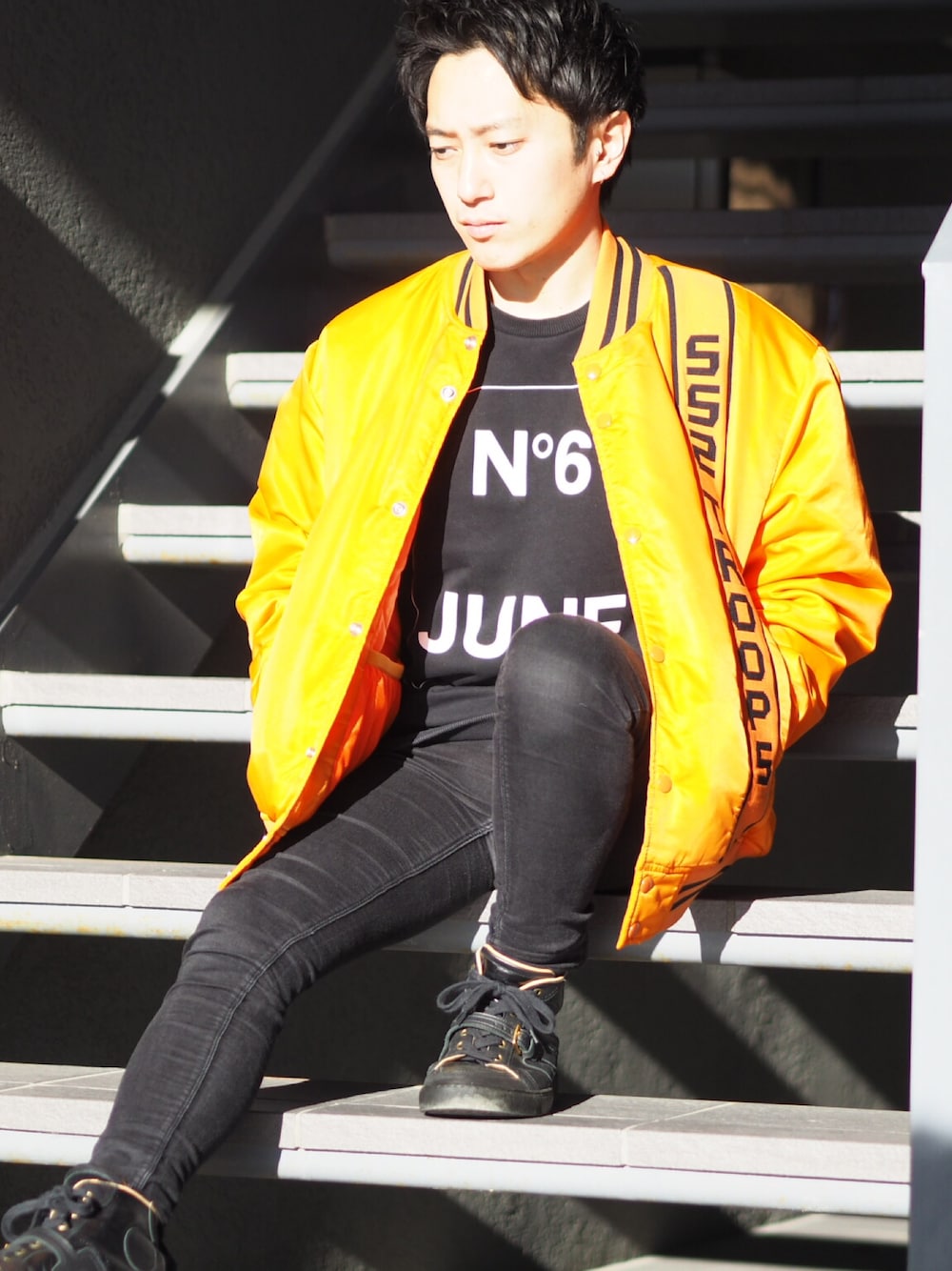今日はこんな感じ! アウターとトップスはゆるめにボトムはタイトにチョイスしました! 差し色にオレンジのブルゾンでアクセントに!