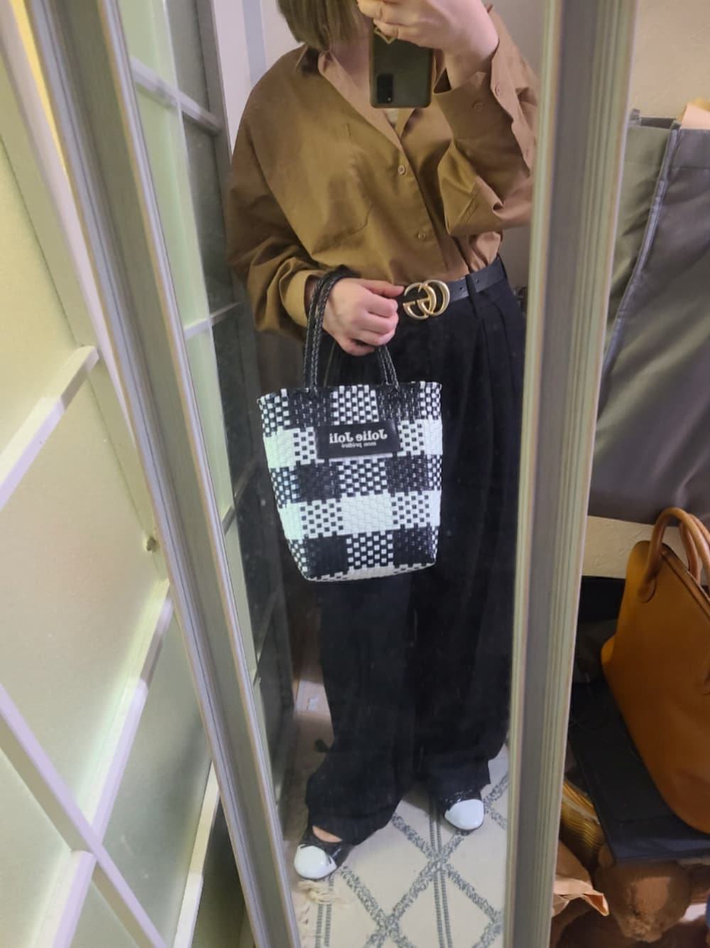 茶色のシャツに黒のリネンパンツ さらっとしてて動きやすいパンツです カバンは夏ぽく編み編みバッグ