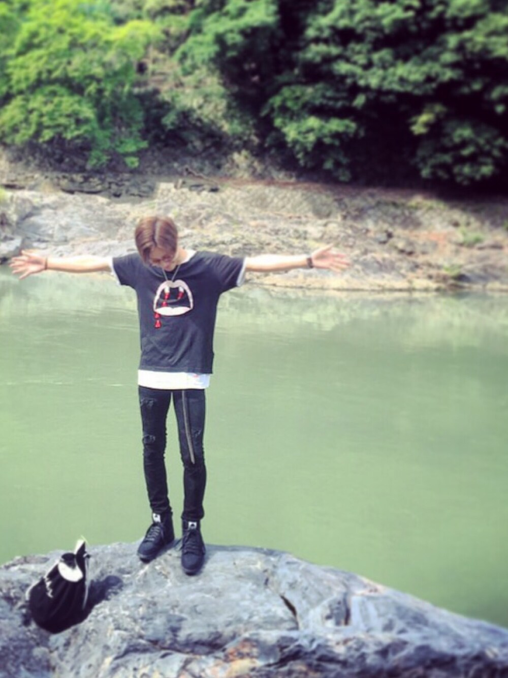 京都の嵐山で撮ったpic めちゃくちゃ気持ちよかったです! 細身のブラックコーディネート 夏でもやっぱり黒が良いんですよね!!