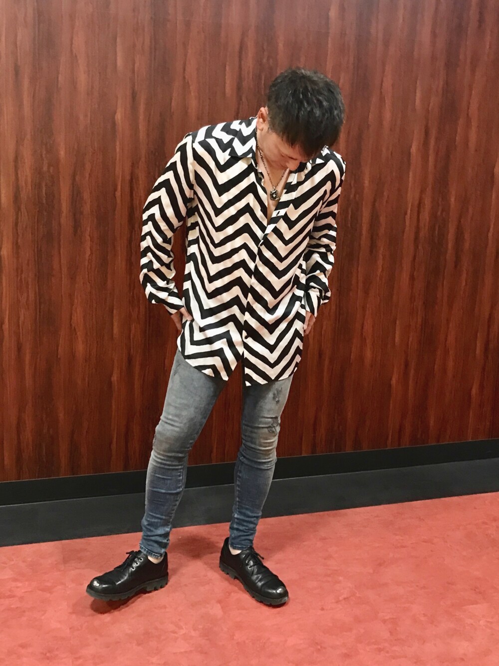 シェブロン柄シャツ×skinnyコーデ✨ 決してシマウマではない シェブロン柄🤔 レディースskinnyデニムは ダメージ感がお気に入り🎶