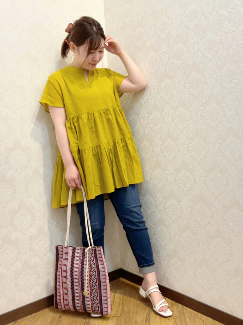 ご覧いただきありがとうございます✿.*·̩͙ ブラウスは前回の色違いイエローを着用しました(˶ᵔᵕᵔ˶) 同じデニムで合わせても 全然違う印象に🐣💓 ティアードデザインは 体型カバーできるので重宝しますよ〜₍ᵔ· ̫·ᵔ₎