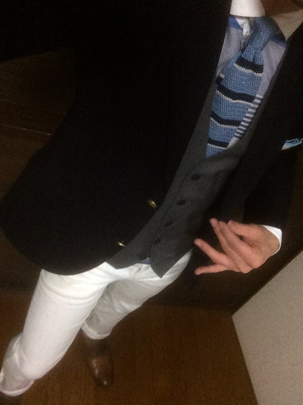 紺ブレ×白パンツ シャツ、ネクタイのボーダ合わせ🤗