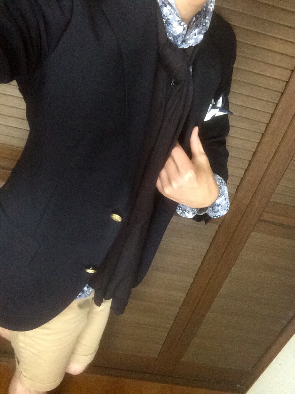 紺ブレ×柄シャツstyle✨ ノータイ、コットンストール、ショートパンツで春夏っぽさを演出✋