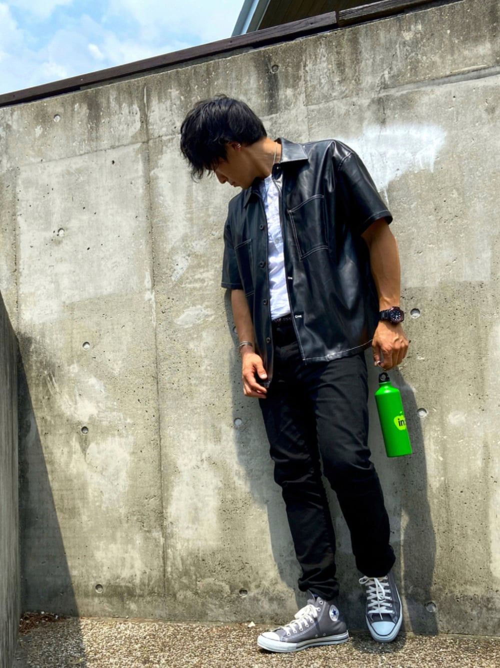 おはようございます、dakuyanです💨 いい感じの高さの壁を見つけました👀最近暑くて外撮りが大変です🤣 パンツはスキニーなのでオーバーサイズのCPOシャツでYライン意識です✨ SHIPSのシャツはタックインしてます😊 今日も1日よろしくお願いします🤲
