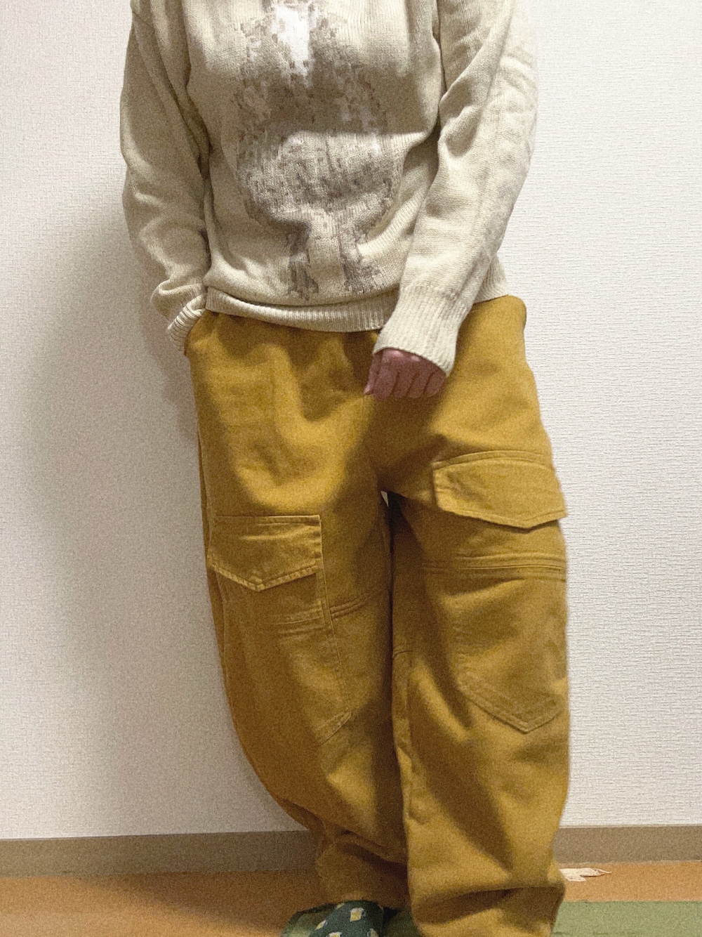 マスタードカラーのカーゴパンツが裏起毛になってて、ニットを合わせたらぬくぬくコーデに。 色味を合わせて統一感を出してみました。 寒い日でも元気に動けるコーデです。 サイズは全てフリーサイズ。
