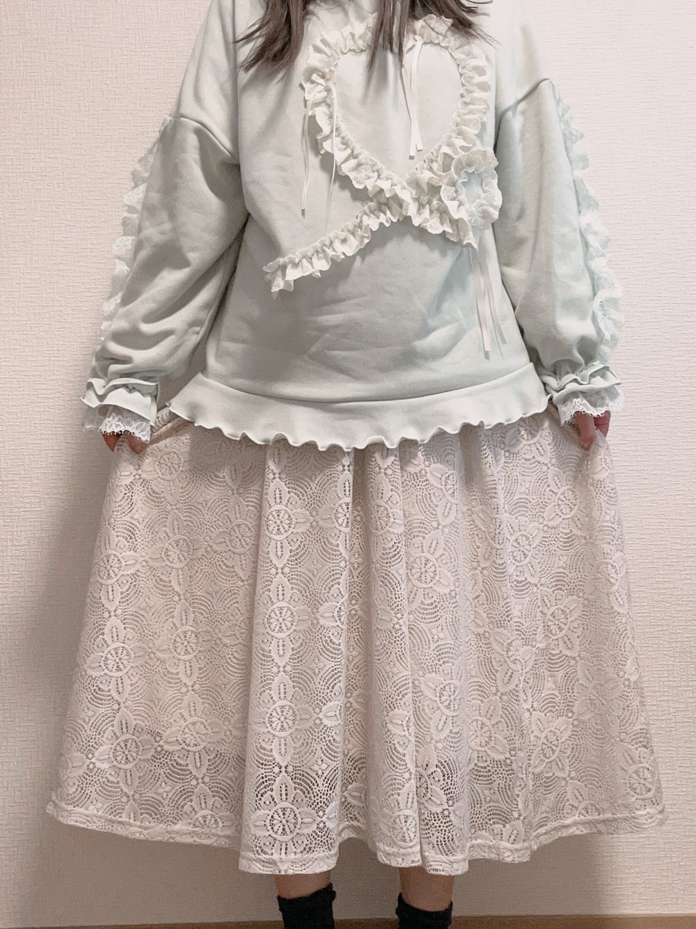 レース満載のガーリーなコーデです。 スウェットはフリーサイズ、スカートはLサイズです。
