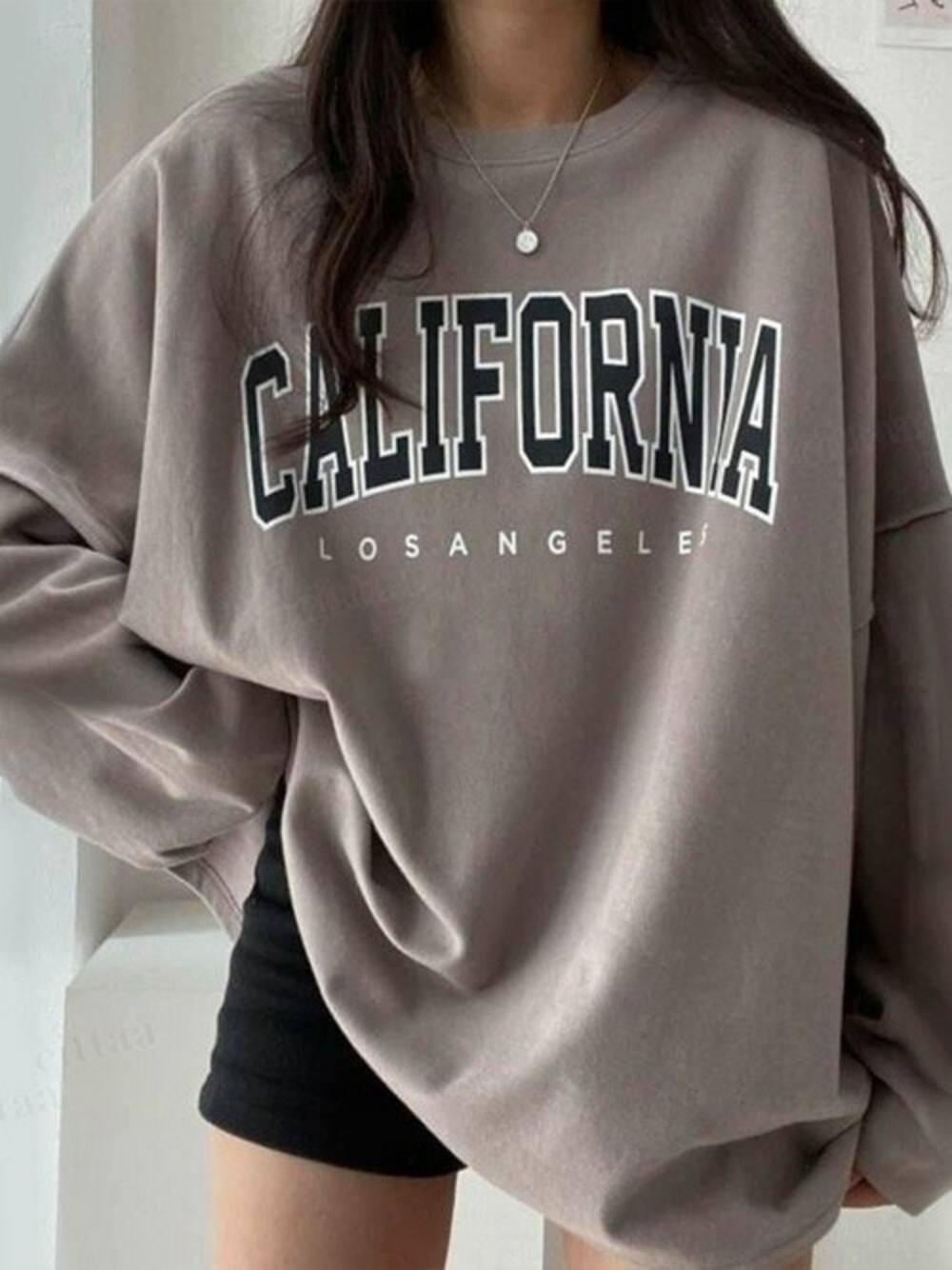 Dalfwinスタッフのスウェット「韓国ファッションCALIFORNIAカレッジロゴオーバーサイズスウェット」を使ったコーディネート