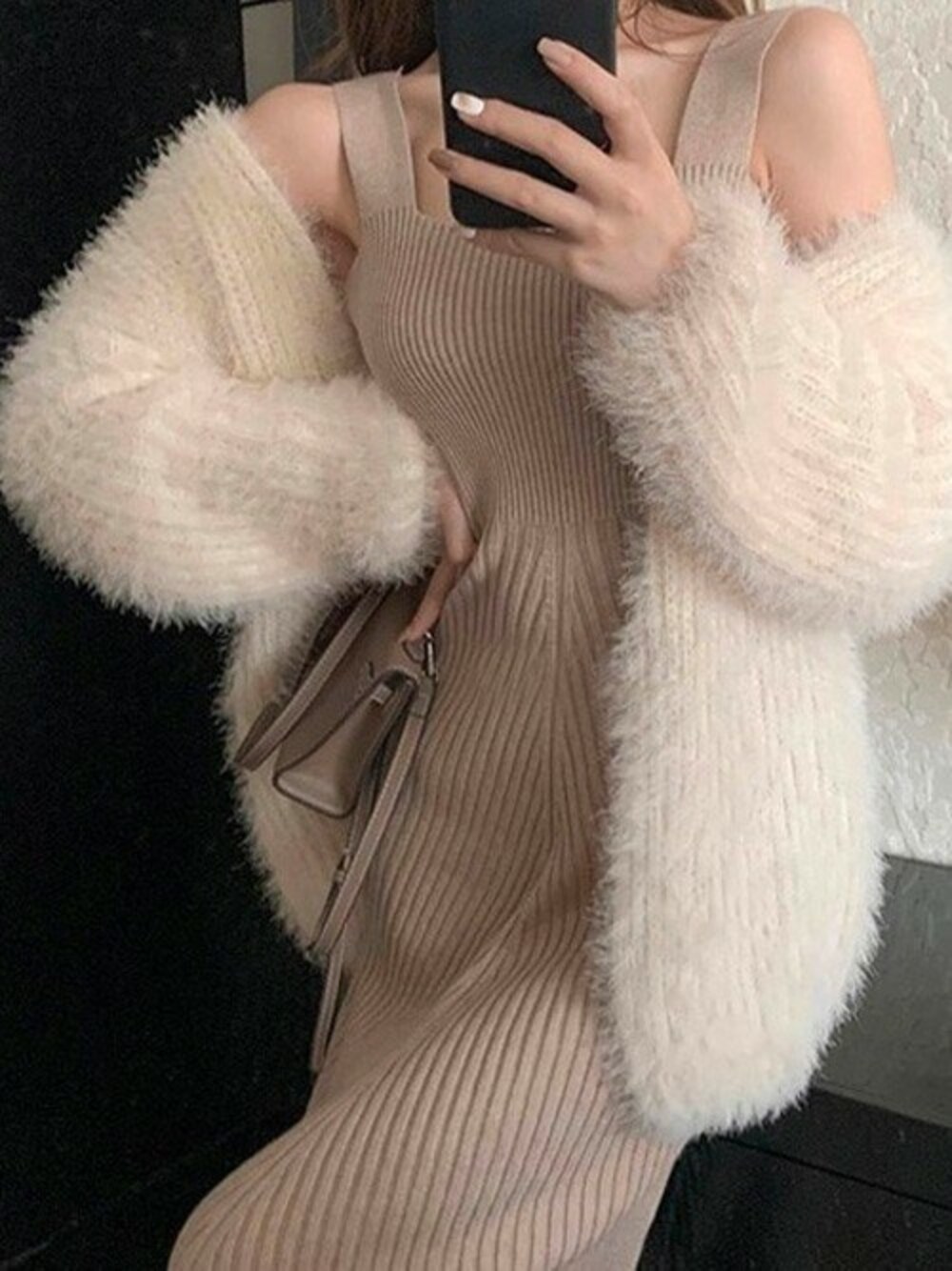 ふわふわシャギーが可愛いニットカーディガンは彼ウケもバッチリ😎👌 秋デートにもってこいのアイテムです💗 キャミワンピにさっとカーディガンを羽織った 今の時期ならではのコーデが可愛い💯
