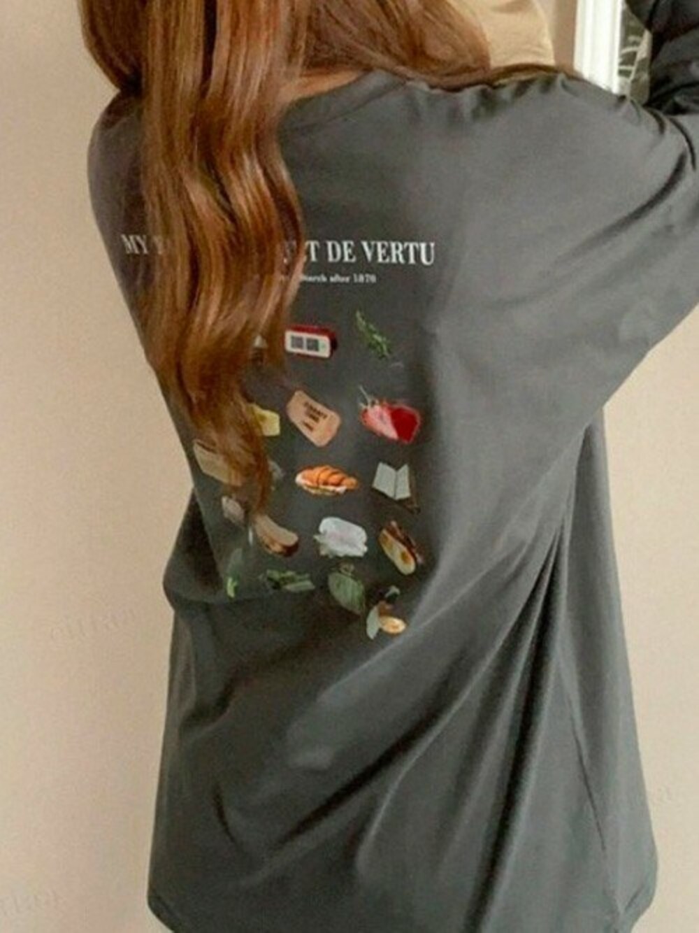 後ろ姿まで可愛いロンTコーデ🍓💕 小さなイラストが並んだデザインが可愛すぎる! リアルタッチなプリントで子供っぽくなりすぎないのがポイント😎👌✨ そのまま1枚でも、カーデのインナーにも、レイヤードにも マルチに活躍するロンTは何枚あっても嬉しいアイテムですよね💖