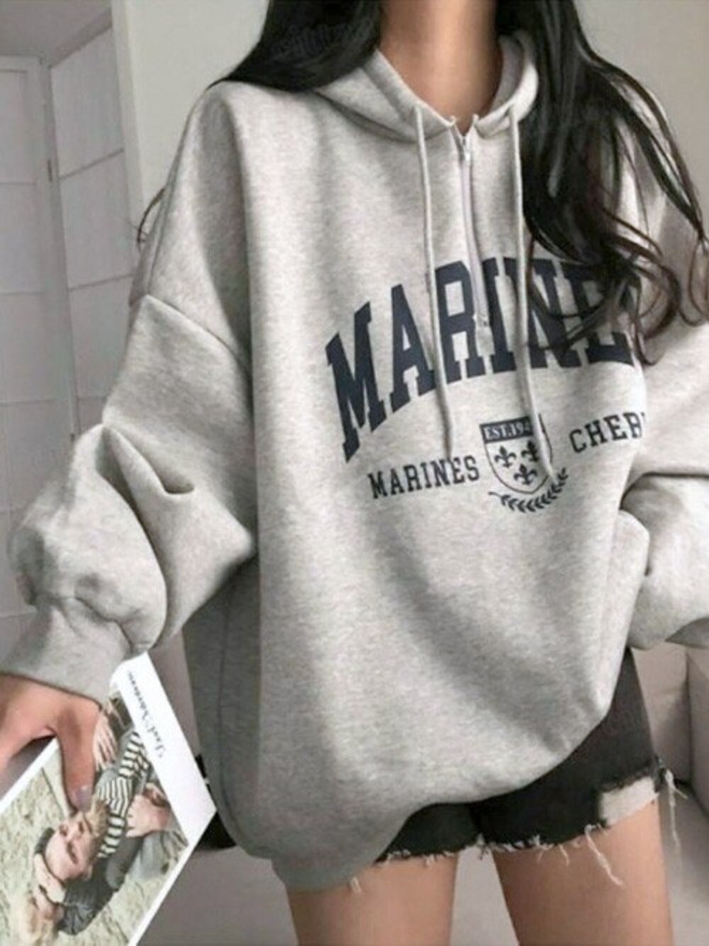 Dalfwinスタッフのパーカー「韓国ファッションMARINESロゴハーフジップ長袖オーバーサイズパーカー」を使ったコーディネート