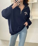 トレンド感抜群ハーフジップスウェットコーデ💙 国旗刺繍のアメカジな雰囲気がお洒落!🗽🇺🇸 ゆるっとルーズなシルエットもこなれ感たっぷりで シンプルにデニムと合わせるだけでも可愛い🙈💕 インナーにTシャツやハイネックを合わせても今っぽくてオススメ👌✨ ユニセックスで着用できるので彼とリンクコーデも楽しめる🙆♀️🙆♂️ 裏起毛ナシタイプのスウェットなので 春まで長く楽しめるアイテムです💯