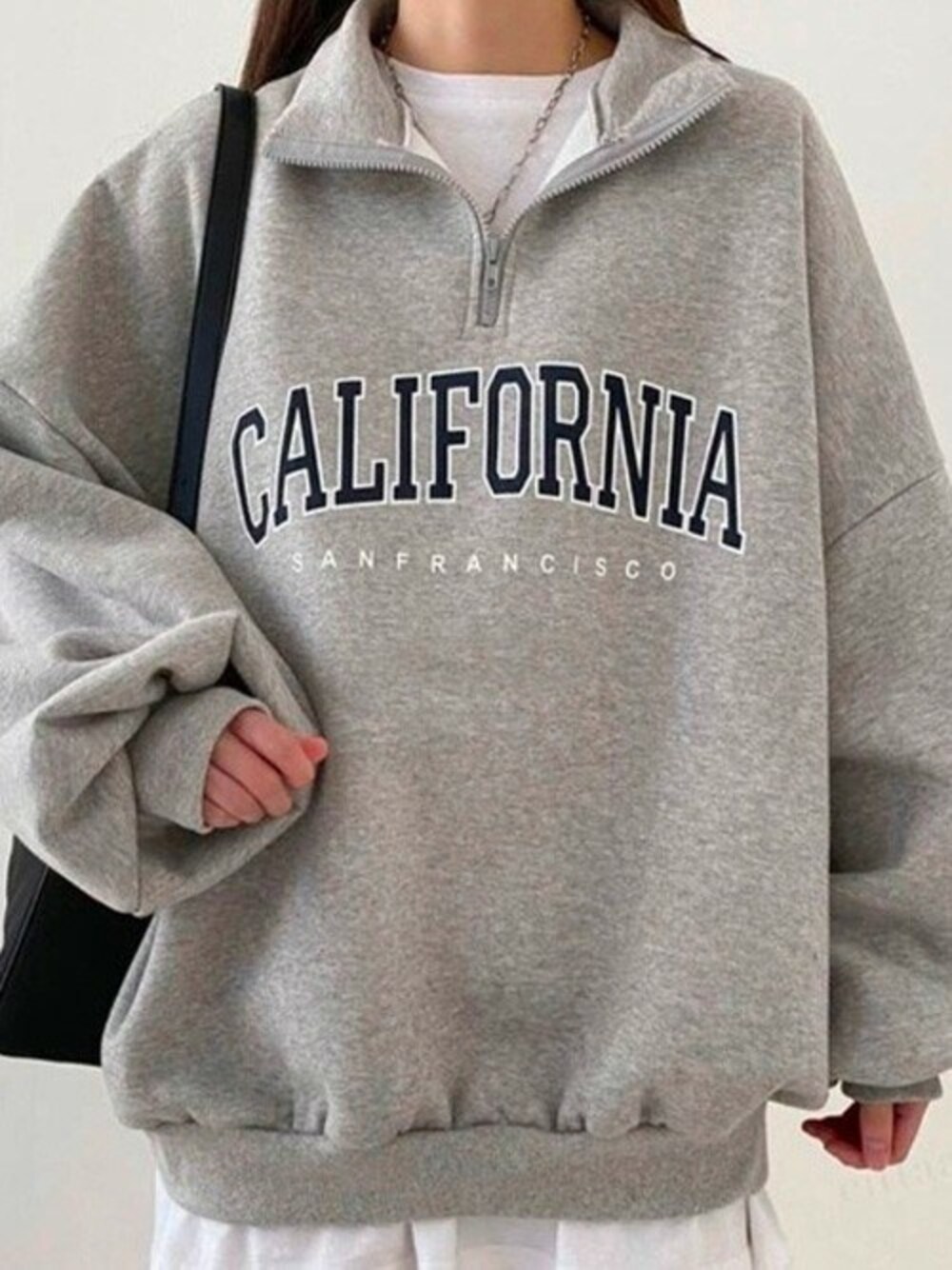 Dalfwinスタッフのスウェット「韓国ファッションCALIFORNIAロゴハーフジップオーバーサイズスウェット」を使ったコーディネート
