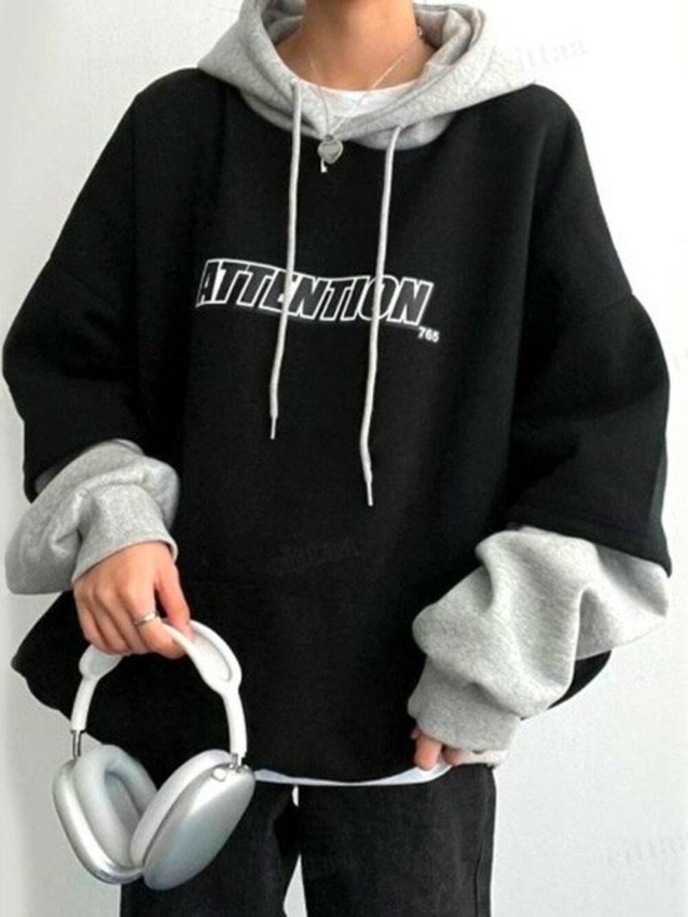 Dalfwinスタッフのパーカー「2023AW 秋冬新作 韓国ファッション パーカー スウェット レディース バイカラーレイヤードフーディー ビッグシルエット オーバーサイズ 男女兼用 ペア ユニセックス」を使ったコーディネート
