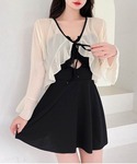 フリルデザインボレロがセットになったワンピース水着💎 ヘルシーな肌見せが叶うシアー素材☁️ 肌の露出や強い日差しが気になるときに💯 ワンピース水着単体ももちろん可愛い🙆♀️ 動くたびに揺れるふんわりフレアシルエットで 気になる腰回りのラインをカバー💕 トレンド感抜群のカットオフデザインもポイントです! モノトーン配色で大人っぽい雰囲気がお洒落✨