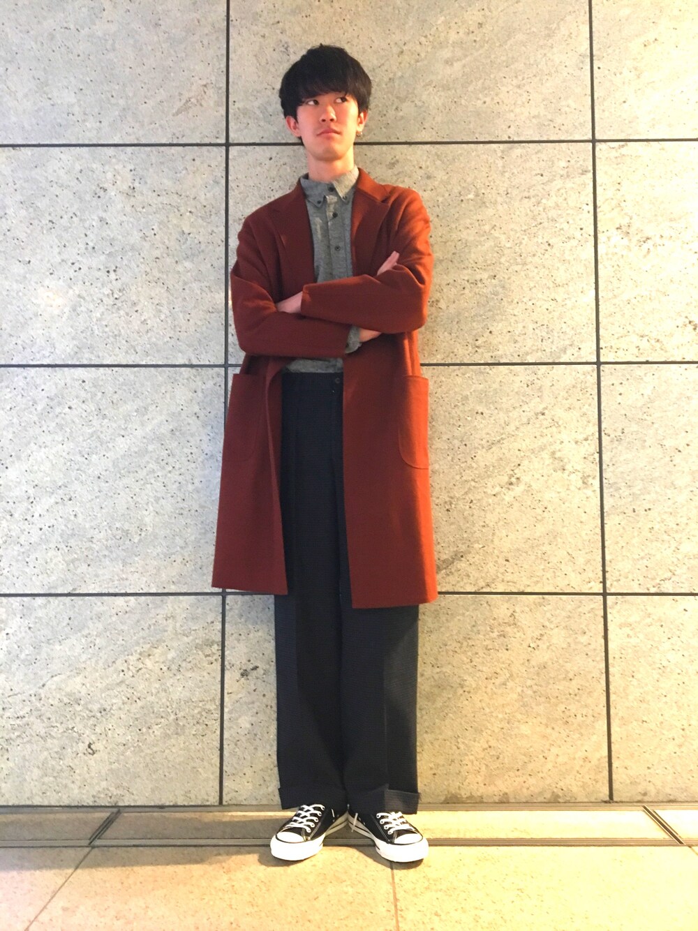 ウールオーバーコートを使ったコーデ。 トレンドが続いてるワイドパンツを合わせ、シャツをきれい目なもので合わせて全体的にきれい目なコーデに仕上げました。 足元にスニーカーを合わせて少し抜け感のあるスタイルに。
